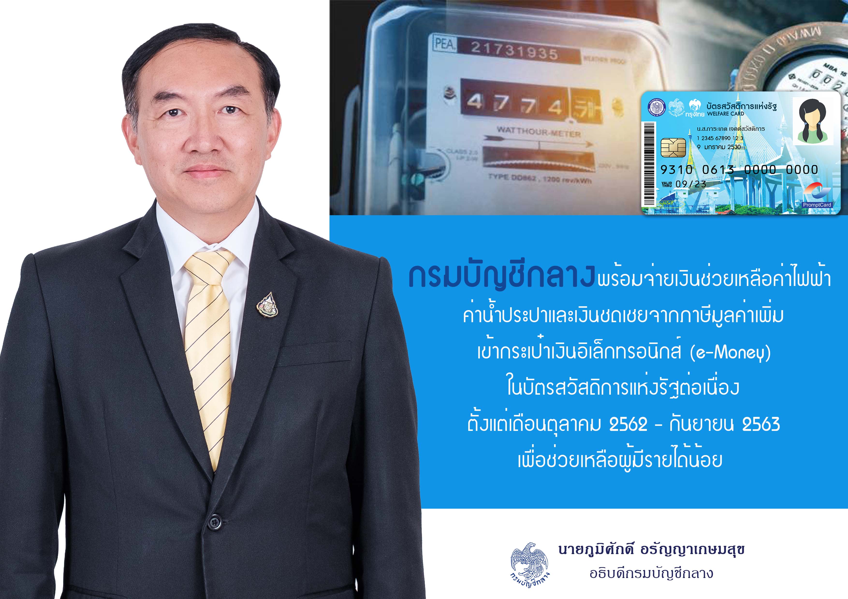 ลงทะเบียนรับสิทธิ กับการไฟฟ้านครหลวง (กฟน.) www.mea.or.th การประปานครหลวง (กปน.) www.mwa.co.th ต่างจังหวัดลงทะเบียนรับสิทธิกับการไฟฟ้าส่วนภูมิภาค (กฟภ.) www.pea.co.th สำนักงานกิจการไฟฟ้าสวัสดิการสัตหีบ และการประปาส่วนภูมิภาค (กปภ.) www.pwa.co.th หรือที่สำนักงานการไฟฟ้า/สำนักงานประปา ทุกแห่ง” อธิบดีกรมบัญชีกลาง กล่าว