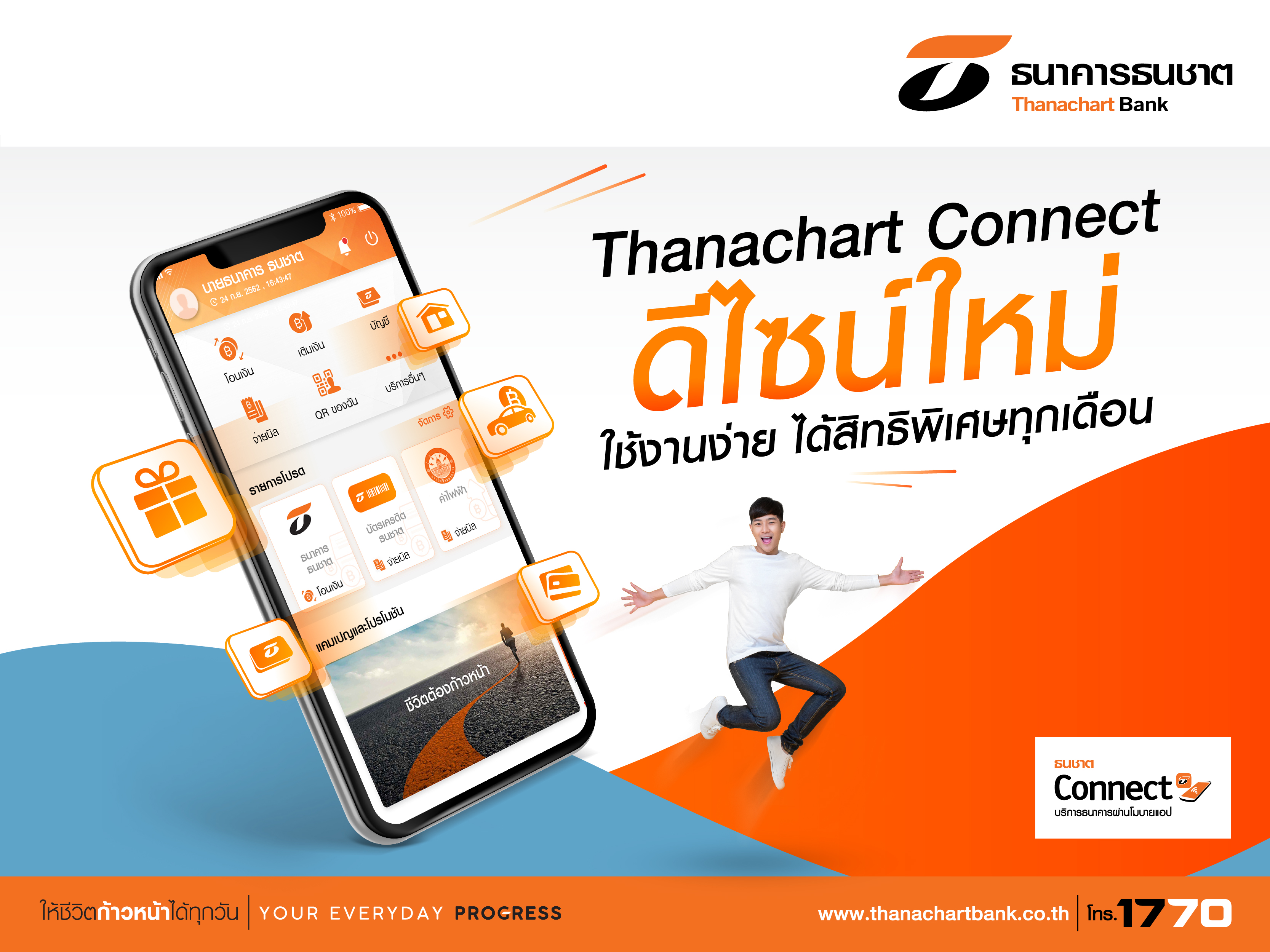 15 ตุลาคม 2562 : ธนาคารธนชาต จำกัด (มหาชน) เปิดตัวดีไซน์ใหม่ของ Thanachart Connect โมบายแอป ซึ่งจะอวดโฉมให้ลูกค้าได้ใช้งานกันตั้งแต่วันที่ 16 ตุลาคม 2562 นี้เป็นต้นไป โดยลูกค้าจะได้พบกับหน้าตารูปแบบใหม่ที่มีเมนูใช้งานได้ง่ายขึ้น สวยงามทันสมัยน่าใช้กว่าเดิม และลดขั้นตอนการทำธุรกรรมให้สำเร็จได้เพียงไม่กี่คลิก ไม่ว่าจะเป็นการโอนเงิน เติมเงิน จ่ายเงิน ตรวจเครดิตบูโร หรือซื้อขายสับเปลี่ยนกองทุนก็ทำได้ง่าย ๆ และพิเศษยิ่งขึ้นสำหรับลูกค้า Thanachart Connect เพียงโอน เติม จ่าย ครบ 5 รายการต่อเดือน ก็รับสิทธิพิเศษจาก Shopee, Tesco Lotus, Chester’s Grill และร้านค้าที่ร่วมรายการได้ทุกเดือนตามเงื่อนไขที่ธนาคารกำหนด