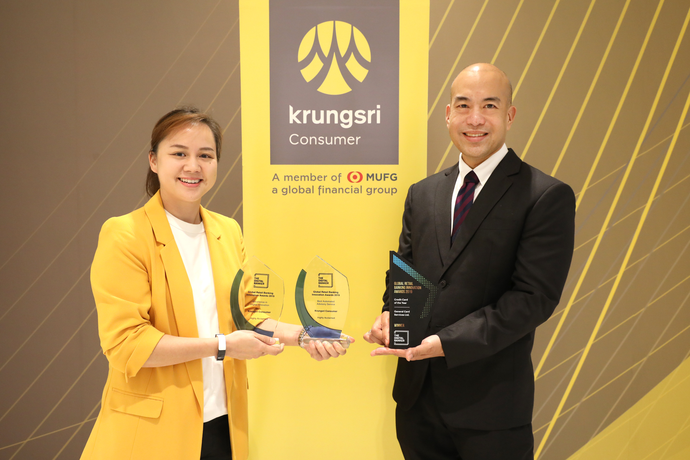 15 ตุลาคม 2562 : นายอธิศ รุจิรวัฒน์ (ขวา) กรรมการผู้จัดการ บริษัท เจเนอรัล คาร์ด เซอร์วิสเซส จำกัด และ ดร.ลิสา พัทธ์วิวัฒน์ศิริ (ซ้าย) ผู้อำนวยการอาวุโส ฝ่ายปฏิรูปธุรกิจ กรุงศรี คอนซูมเมอร์ เป็นตัวแทนกรุงศรี คอนซูมเมอร์ ผู้นำในธุรกิจบัตรเครดิตและสินเชื่อส่วนบุคคล รับ 3 รางวัลใหญ่ จากเวที Global Retail Banking Innovation Awards 2019