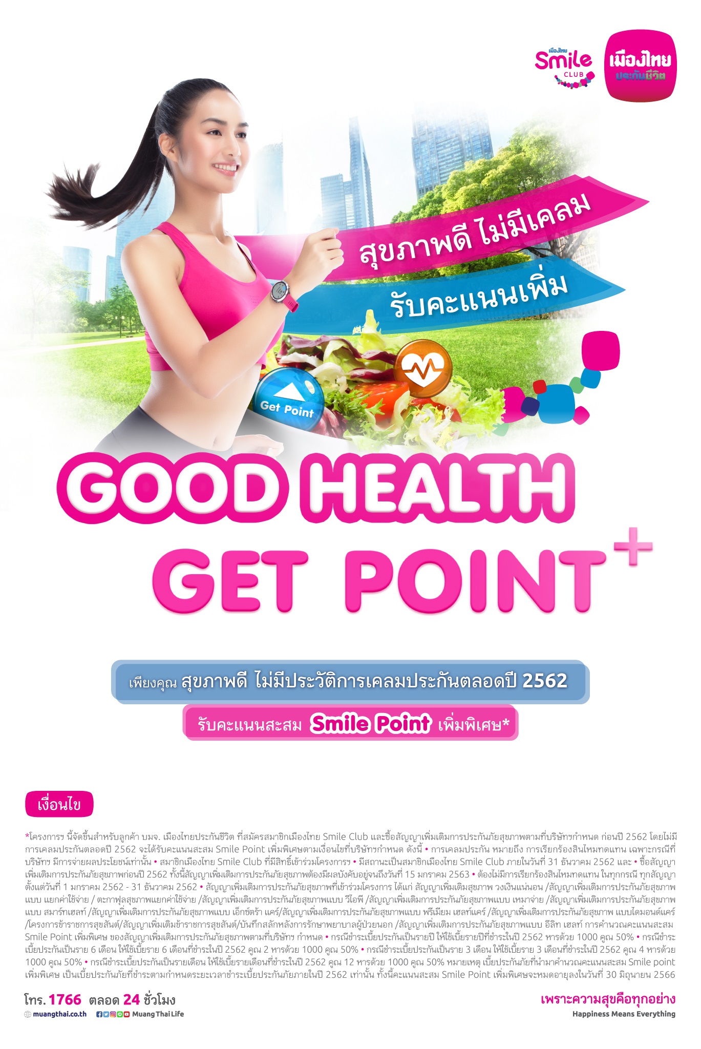 นอกจากนี้สมาชิกฯ ยังสามารถรับคะแนนสะสม Smile Point เพิ่มพิเศษได้จาก แคมเปญ Good Health Get Point เพื่อให้สมาชิกฯ ที่สุขภาพดี และไม่มีประวัติการเคลมตลอดทั้งปี รับคะแนนสะสม Smile Point เพิ่มพิเศษ (เงื่อนไขเป็นไปตามที่บริษัทฯ กำหนด) สามารถดูรายละเอียดกิจกรรมและสิทธิประโยชน์ต่างๆ เพิ่มเติมได้ที่ www.muangthai.co.th