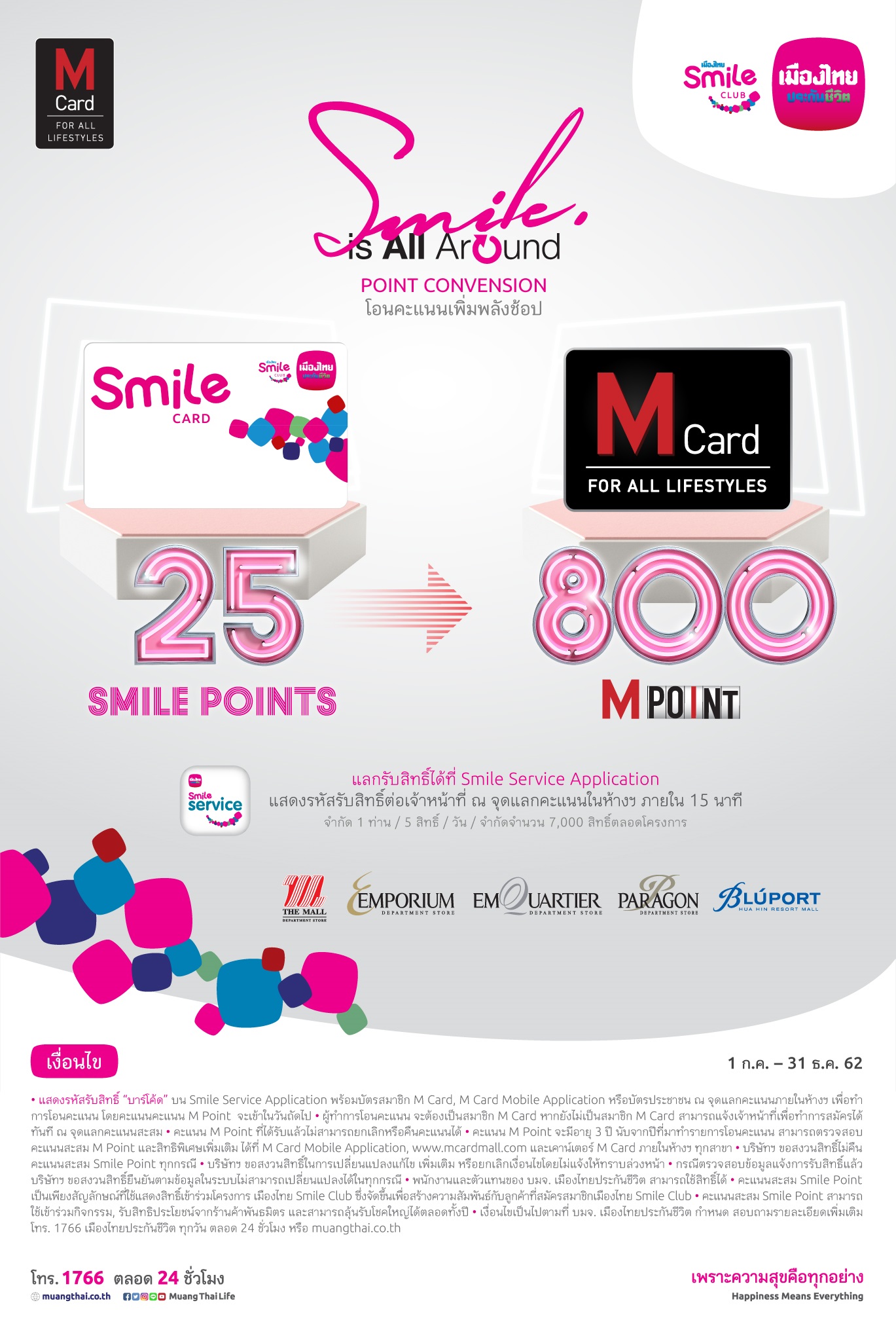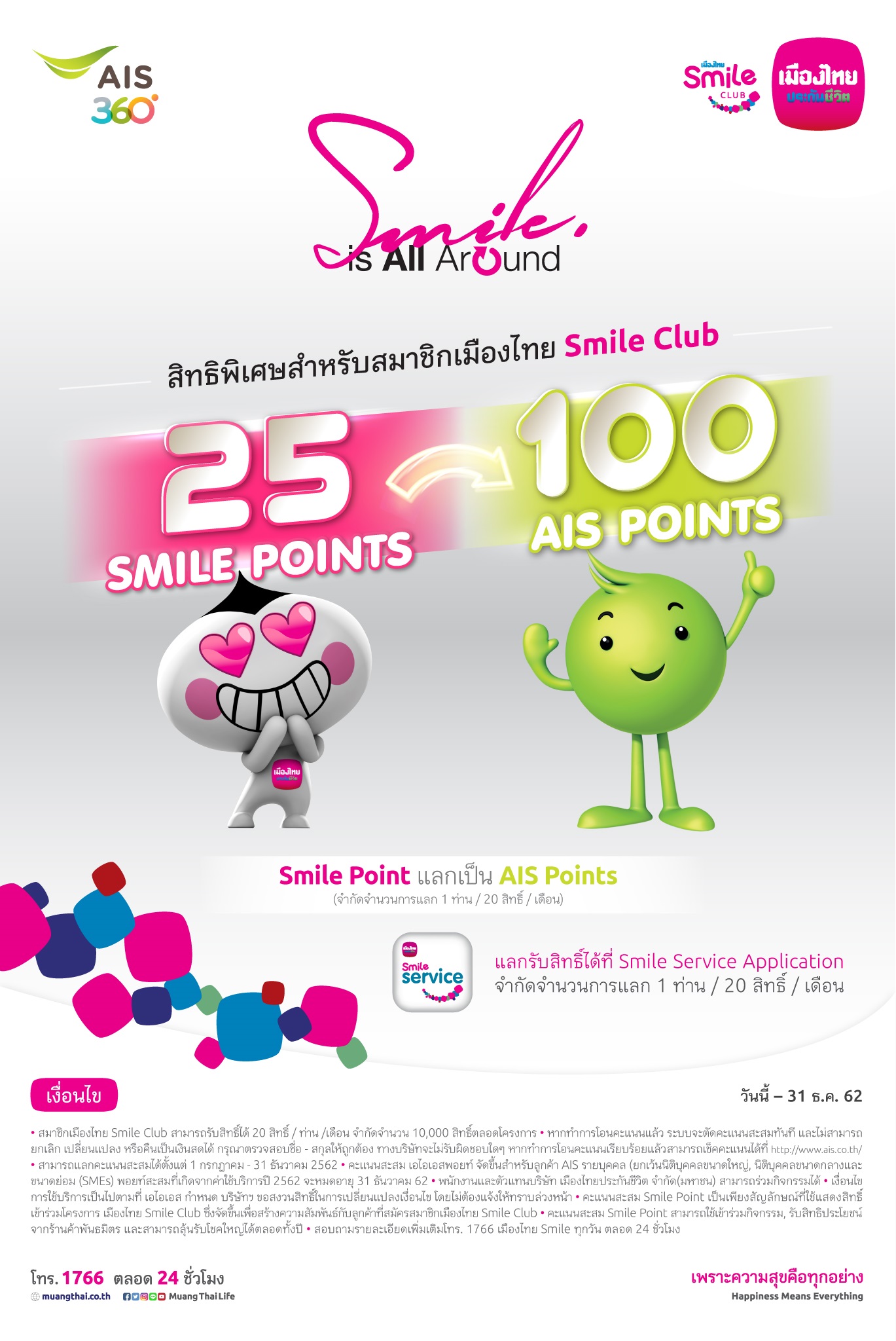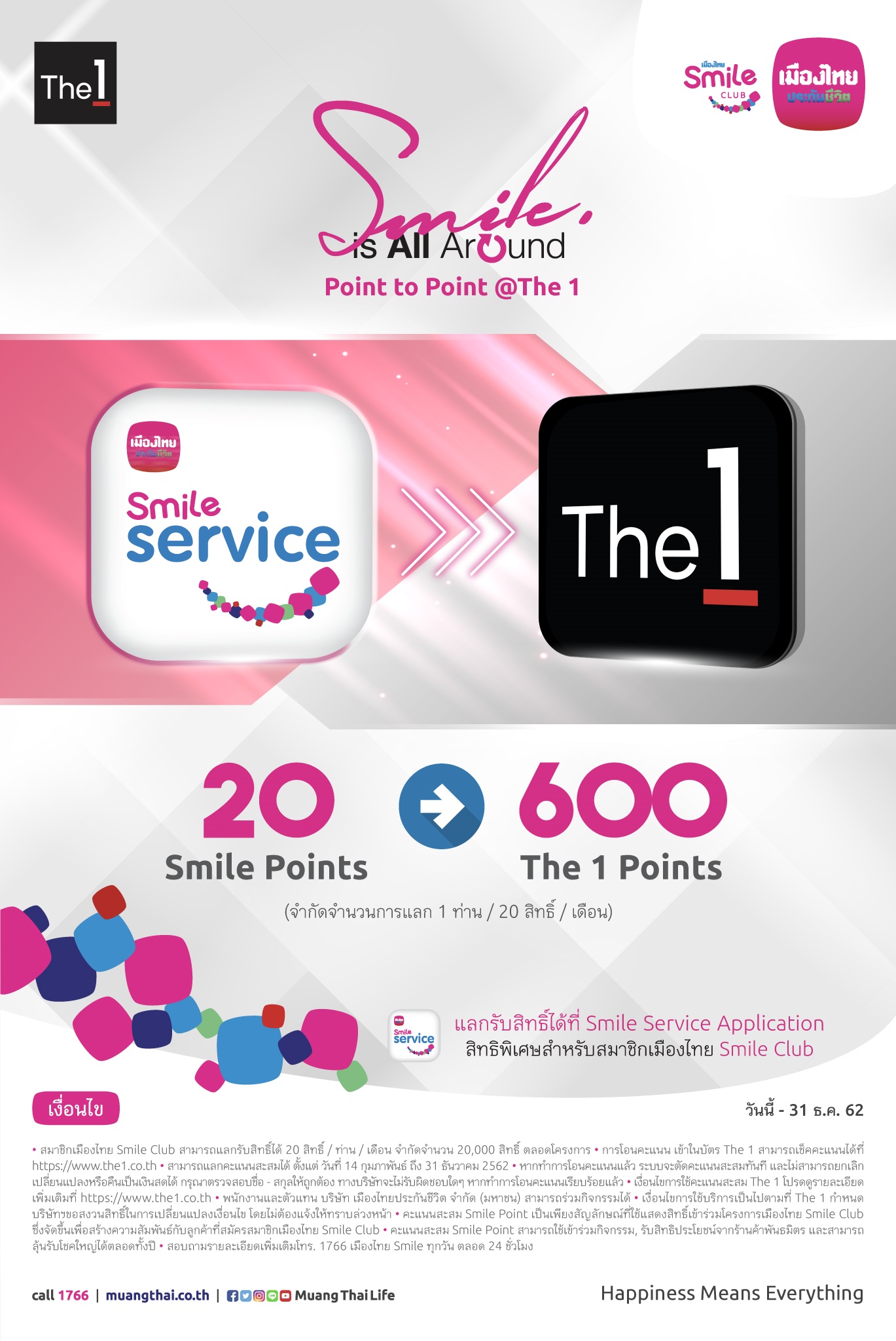 ล่าสุด เมืองไทย Smile Club พร้อมมอบกิจกรรมและสิทธิประโยชน์มากมาย เพียงคุณเป็นสมาชิกฯ ก็สามารถใช้ Smile Point แลกเข้าร่วมกิจกรรม แลกรับส่วนลด แลกรับสินค้าหรือแลกรับบริการ และพิเศษสุด! ให้สมาชิกฯ รับความสุขมากขึ้นจาก Smile Point ผ่าน แคมเปญ Point to Point โดยการโอนคะแนนสะสม Smile Point เป็นคะแนนสะสมของพันธมิตรชั้นนำระดับประเทศที่เข้าร่วมโครงการ เพื่อรับสิทธิประโยชน์อื่นๆ อีกมากมาย