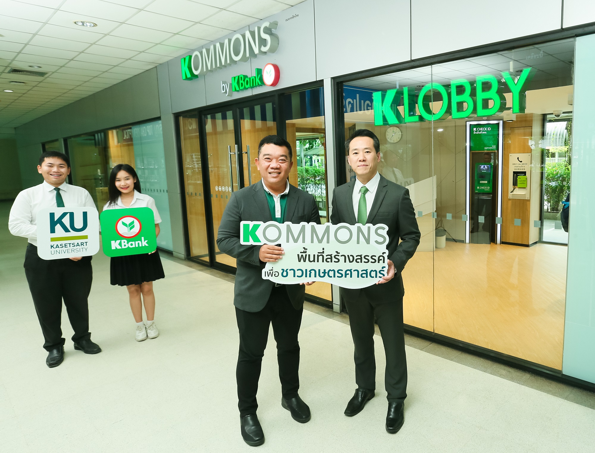 18 ตุลาคม 2562 : ชลัฐ ศิริพงศ์วุฒิกร (ขวา) ผู้ช่วยกรรมการผู้จัดการ ธนาคารกสิกรไทย และผู้ช่วยศาสตราจารย์ รัชด ชมภูนิช (ซ้าย) รองอธิการบดี มหาวิทยาลัยเกษตรศาสตร์ ร่วมเปิด “KOMMONS by KBank” ช่องทางบริการรูปแบบใหม่ของธนาคารกสิกรไทยและพื้นที่สร้างสรรค์เพื่อชาวเกษตรศาสตร์ รองรับการใช้ชีวิตในรั้วมหาวิทยาลัยในยุคดิจิทัล ประกอบด้วย สาขาอิเล็กทรอนิกส์ (New K-Lobby) ที่สามารถฝาก/ถอน/ปรับสมุดบัญชีผ่านเครื่องอัตโนมัติได้ด้วยตนเองตลอด 24 ชั่วโมง เครื่อง K CHECK ID รองรับการเปิดบัญชีเงินฝากออมทรัพย์ดิจิทัล (K-eSavings) ผ่านแอป K PLUS และ E-Brochure สแกนคิวอาร์ โค้ด เพื่อเปิดดูผลิตภัณฑ์และบริการของธนาคาร