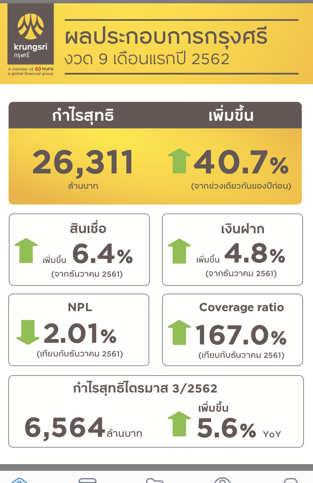 • กำไรสุทธิ: จำนวน 26.3 พันล้านบาท เพิ่มขึ้น 40.7% จากช่วงเวลาเดียวกันของปี 2561