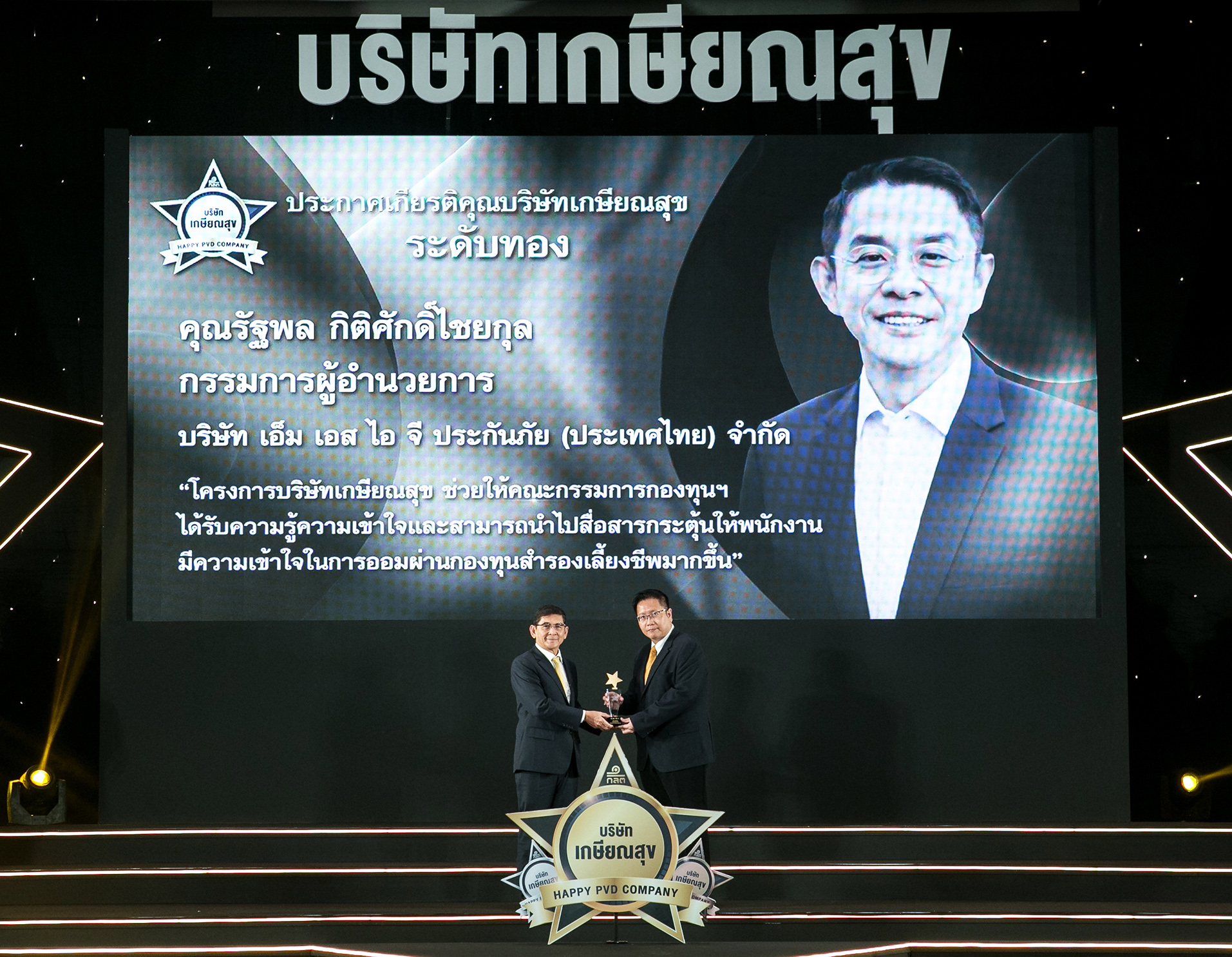 22 ตุลาคม 2562 : ดร. สมเกียรติ สกุลสุรเอกพงศ์ ผู้อำนวยการอาวุโส ทรัพยากรมนุษย์และบริหารประสบการณ์ลูกค้า บริษัท เอ็ม เอส ไอ จี ประกันภัย (ประเทศไทย) จำกัด (มหาชน) เป็นตัวแทนคณะกรรมการกองทุนสำรองเลี้ยงชีพรับรางวัลประกาศเกียรติคุณบริษัทเกษียณสุข ระดับทอง ในโครงการบริษัทเกษียณสุข จัดโดยสำนักงานคณะกรรมการกำกับหลักทรัพย์และตลาดหลักทรัพย์แห่งประเทศไทย (ก.ล.ต.) โดยรางวัลจะมอบให้กับบริษัทที่มีแผนการดูแลสวัสดิการพนักงานผ่านการจัดการกองทุนสำรองเลี้ยงชีพดีเด่น ในการมอบผลประโยชน์ทางการเงินด้วยการสร้างความมั่นคงจากการออมให้กับพนักงาน ![]()