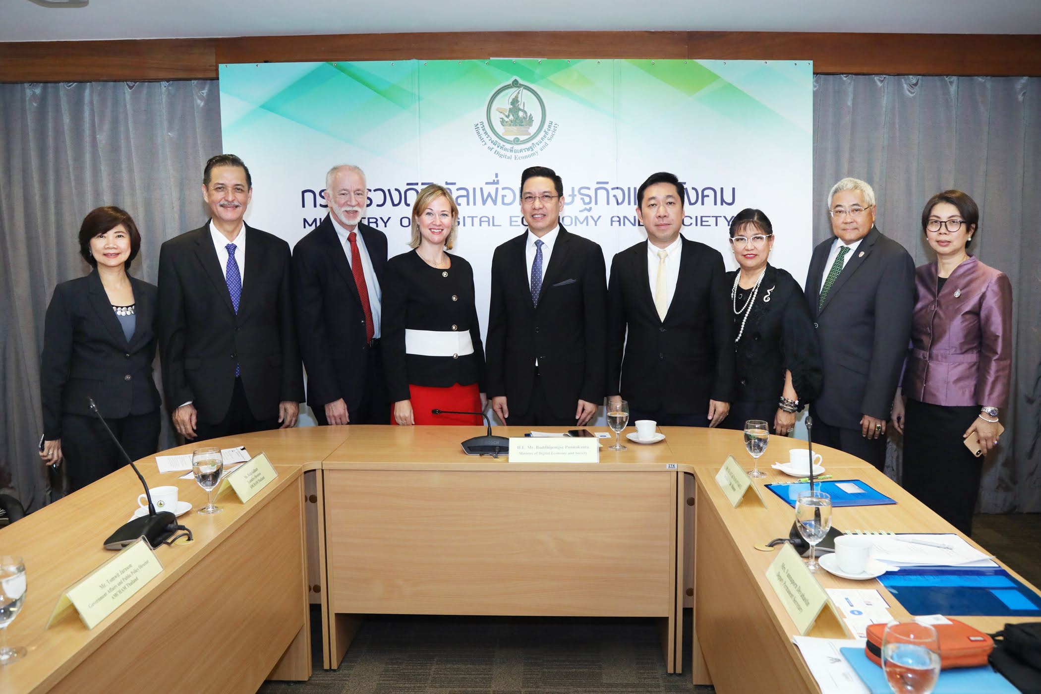 22 ตุลาคม 2562 : กระทรวงดิจิทัลเพื่อเศรษฐกิจและสังคม (Ministry of Digital Economy and Society) โดย พุทธิพงษ์ ปุณณกันต์ (ที่ 5 จากซ้าย) รัฐมนตรีว่าการกระทรวงดิจิทัลเพื่อเศรษฐกิจและสังคม ต้อนรับหอการค้าอเมริกันในประเทศไทย (The American Chamber of Commerce in Thailand: AMCHAM) เข้าเยี่ยมคารวะและพบปะเสวนา นำโดย ไฮดี้ แกลแลนท์, ผู้อำนวยการบริหาร, หอการค้าอเมริกันในประเทศไทย (ที่ 4 จากซ้าย) พร้อมด้วยคณะกรรมการเศรษฐกิจดิจิทัล ประกอบด้วย ปีเตอร์ ฟิชบาช, ประธาน, บริษัท ไอเอสเอ็ม เทคโนโลยี จำกัด (ที่ 3 จากซ้าย) ทอมวิชย์ ชาญสรรค์, ผู้อำนวยการฝ่ายรัฐกิจสัมพันธ์, หอการค้าอเมริกันในประเทศไทย (ที่ 2 จากซ้าย) และ วลีพร สายะสิต ผู้อำนวยการฝ่ายสื่อสารองค์กร บริษัท ที.ซี.ซี. เทคโนโลยี จำกัด (ทีซีซีเทค) (ที่ 1 จากซ้าย)