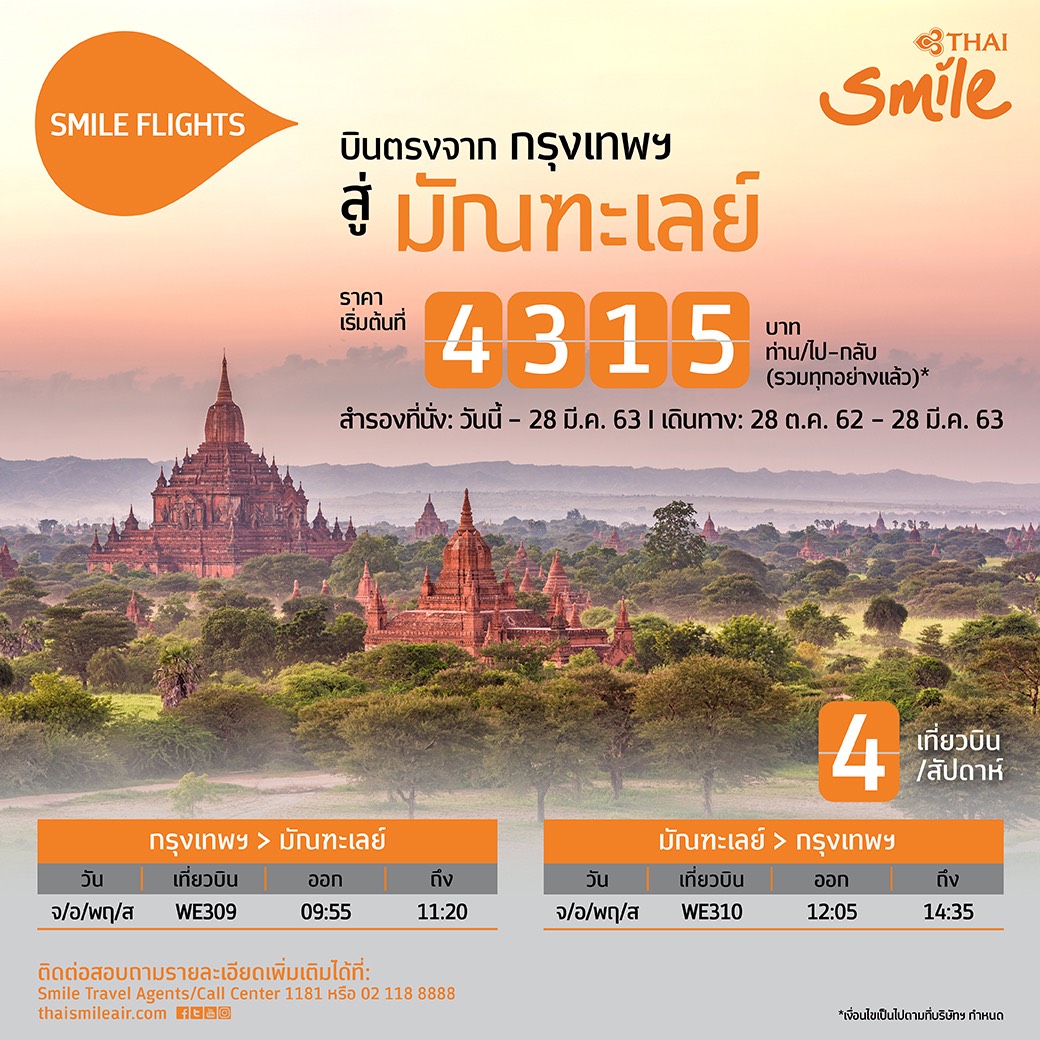 23 ตุลาคม 2562 : สายการบินไทยสมายล์ ชวนนักท่องเที่ยวเดินทางสู่เมืองมัณฑะเลย์ อดีตเมืองหลวง และเมืองใหญ่อันดับที่สองของพม่ารองจากนครย่างกุ้ง รวมทั้งยังเป็นเมืองศูนย์กลางการค้าทางตอนเหนือของพม่าที่รอคอยให้ทุกคนค้นหาและพบกับประสบการณ์การเดินทางแบบเอ็กซ์คลูซีฟ พร้อมบริการแบบฟูลเซอร์วิสโดย เส้นทางกรุงเทพฯ-มัณฑะเลย์ ให้บริการ 4 เที่ยวบินต่อสัปดาห์ ในวันจันทร์ อังคาร พฤหัสบดี และเสาร์ โดยให้บริการ 2 ชั้นโดยสาร ได้แก่ ชั้น Smile Plus (ประหยัดพิเศษ) และ Smile Class (ชั้นประหยัด)