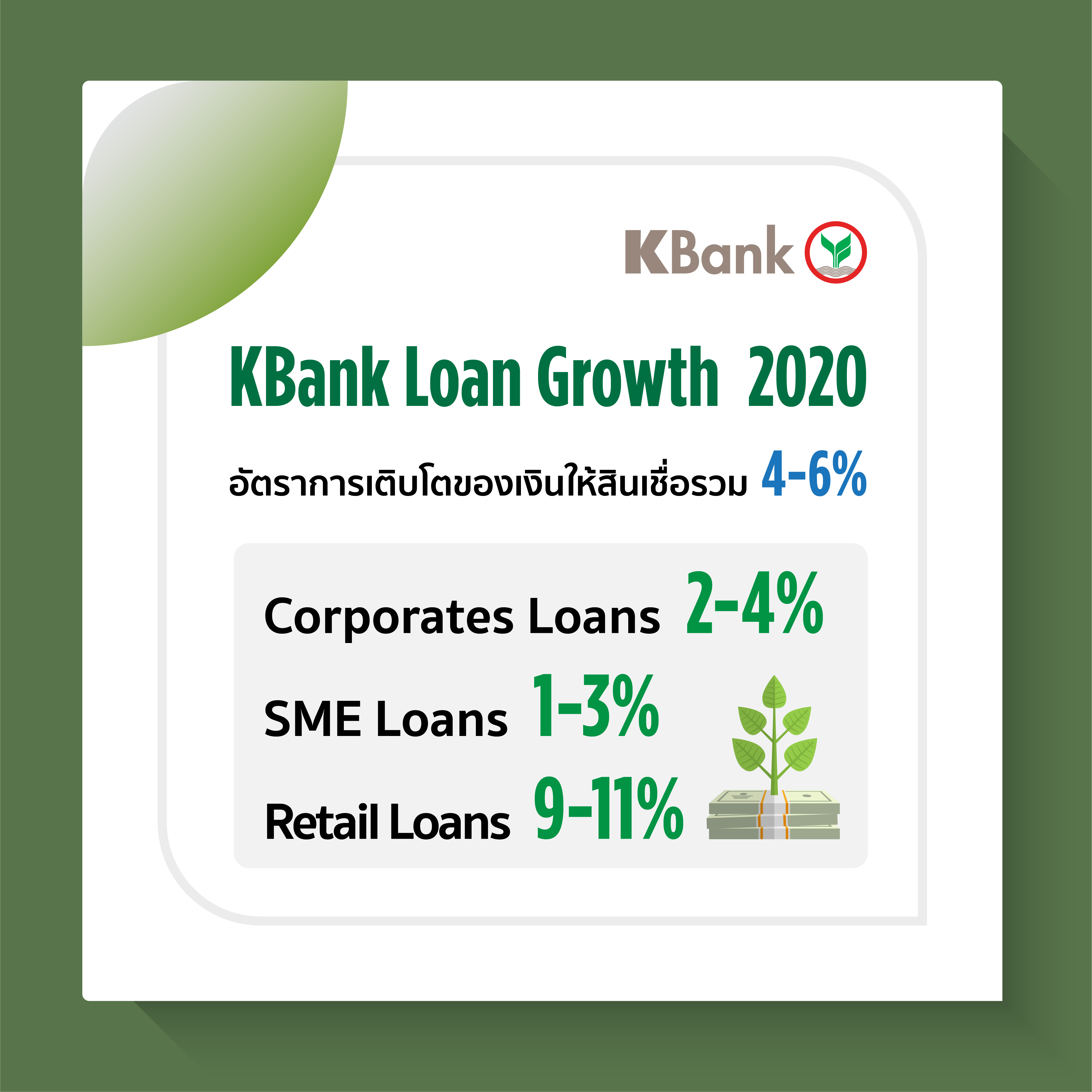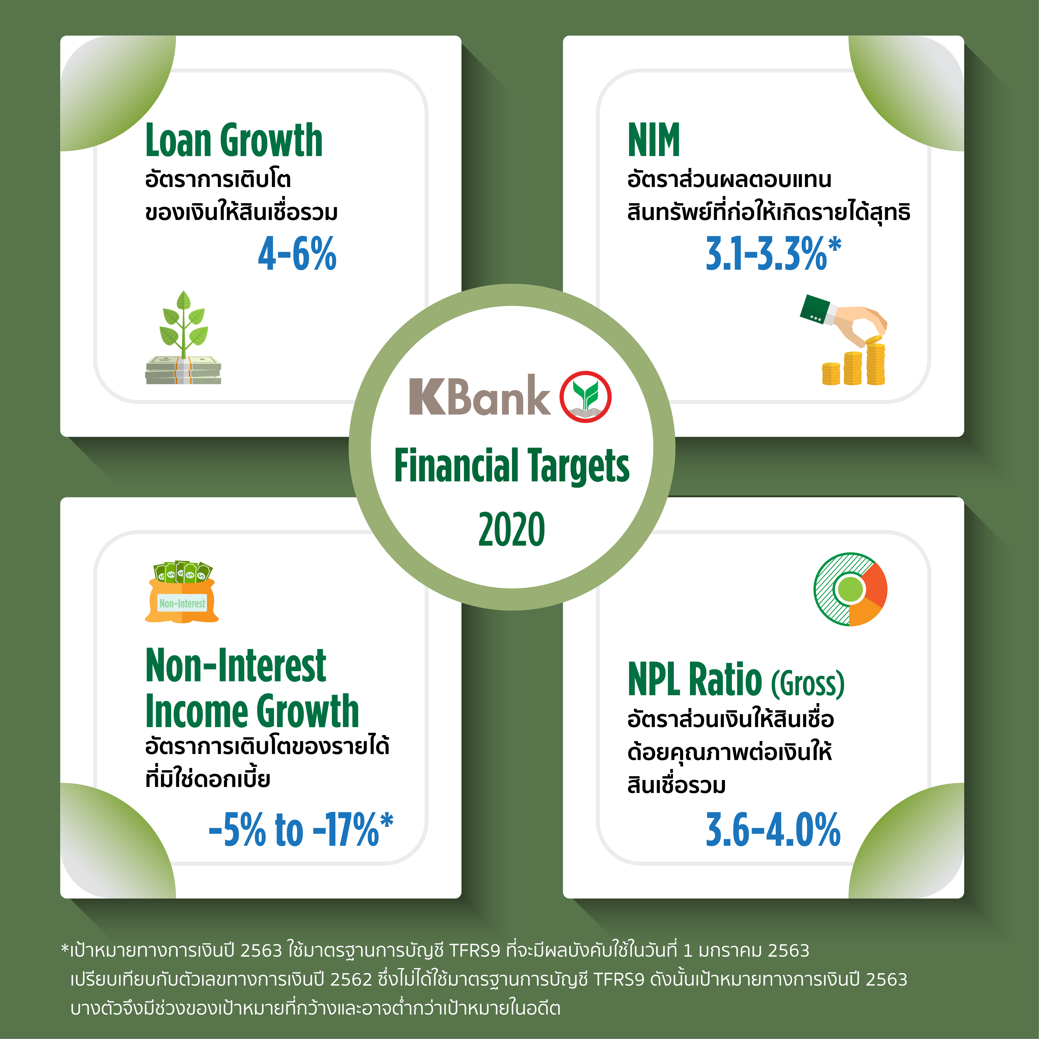 ธนาคารกสิกรไทยได้ประกาศเป้าหมายทางการเงินปี 2563 โดยตั้งเป้าการเติบโตเงินให้สินเชื่อรวมที่ 4-6% แบ่งเป็นสินเชื่อธุรกิจลูกค้าบรรษัทเติบโต 2-4% สินเชื่อธุรกิจลูกค้าผู้ประกอบการเติบโต 1-3% และสินเชื่อลูกค้าบุคคลเติบโต 9-11% อัตราผลตอบแทนสินทรัพย์ที่ก่อให้เกิดรายได้สุทธิ (Net Interest Margin:NIM) อยู่ที่ 3.1ถึง 3.3% อัตราการเติบโตของรายได้ที่มิใช่ดอกเบี้ยอยู่ที่ -5 ถึง -17% ในส่วนของคุณภาพสินทรัพย์ คาดว่ามีสัดส่วนเงินให้สินเชื่อด้อยคุณภาพต่อเงินให้สินเชื่อรวม (NPL Ratio Gross) ที่ 3.6-4.0% ![]()