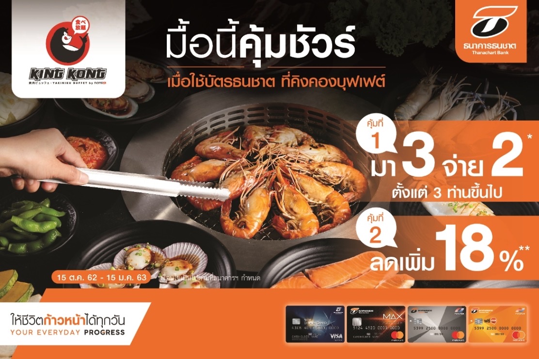1 พฤศจิกายน 2562 : ธนาคารธนชาต จำกัด (มหาชน) จัดโปรเด็ดให้ลูกค้าบัตรเครดิตและบัตรเดบิตธนชาต คุ้มชัวร์ 2 ต่อ อิ่มฟินกับสวรรค์ของคนรักบุฟเฟต์สไตล์ปิ้งย่าง ที่ร้านคิงคอง (King Kong) ทุกสาขา คุ้มต่อที่ 1 รับสิทธิ์ มา 3 จ่าย 2 เพียงสแกน QR Code ที่ร้านเพื่อลงทะเบียนรับสิทธิ์ตามเงื่อนไข คุ้มต่อที่ 2 ลูกค้าบัตรเครดิตธนชาต แลกรับส่วนลดเพิ่ม 18% เมื่อใช้คะแนนสะสมเท่ากับยอดใช้จ่ายตั้งแต่ 1,000 บาทขึ้นไป / เซลล์สลิป โดยลูกค้าสามารถใช้สิทธิ์ได้ตั้งแต่วันนี้ – 15 ม.ค. 2563