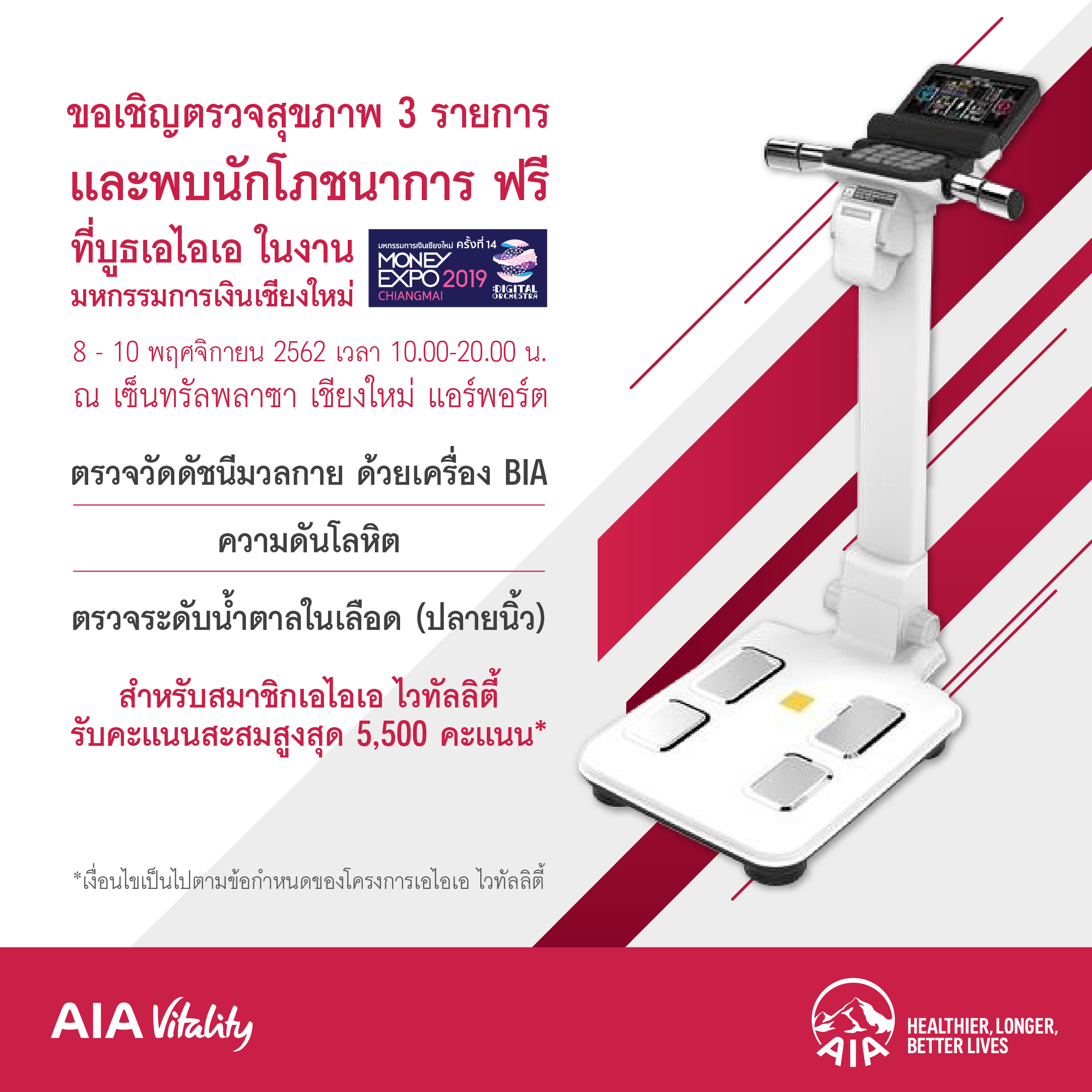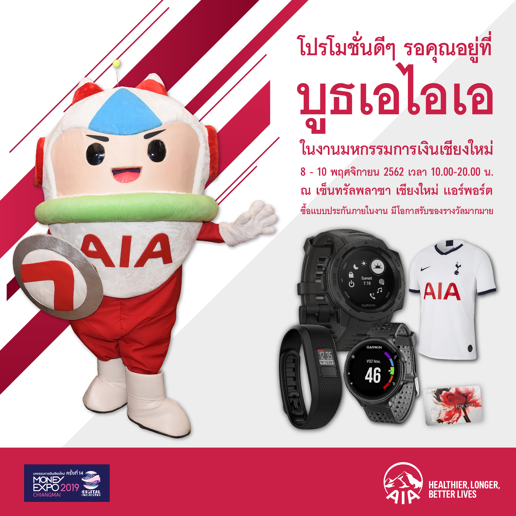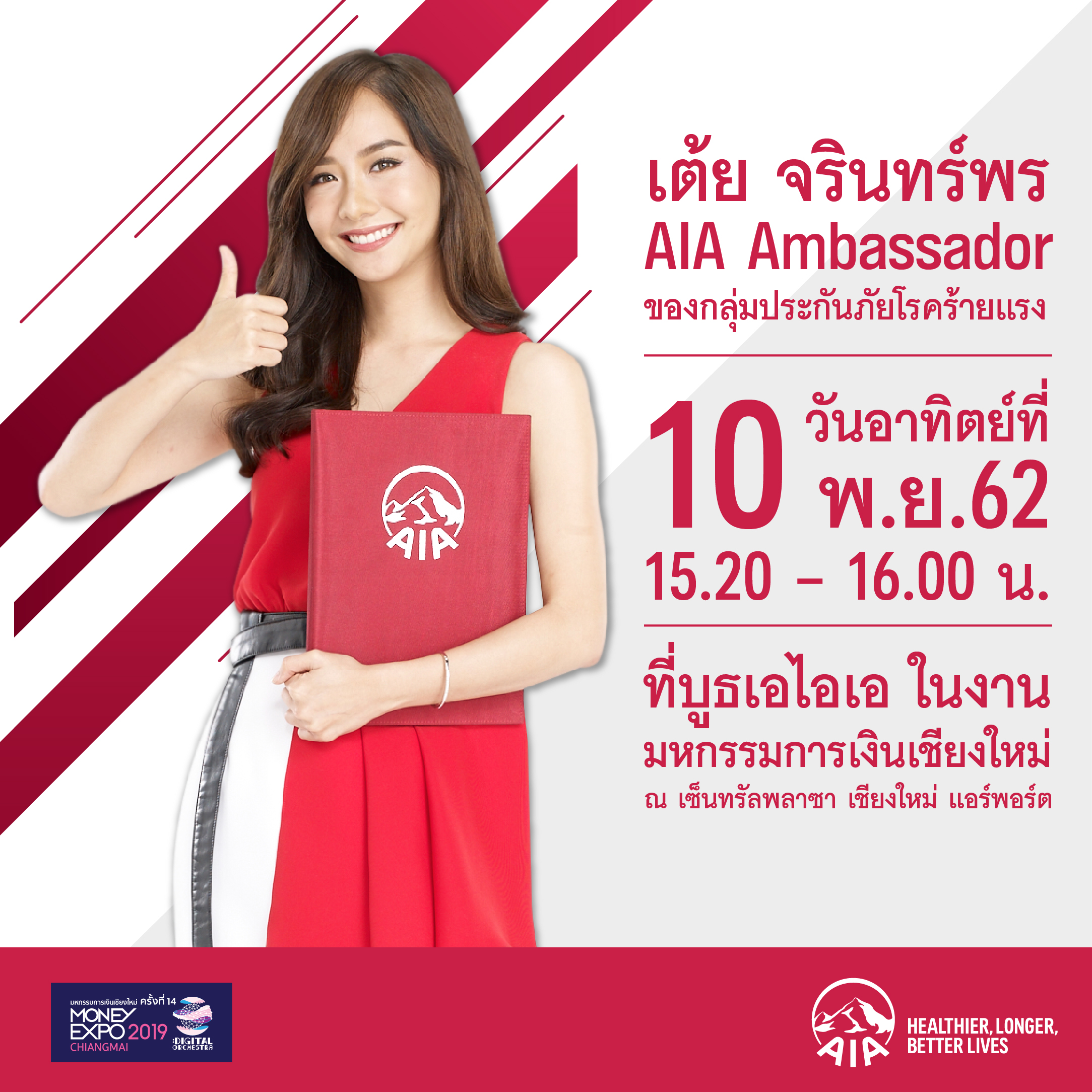 5 พฤศจิกายน 2562 : เอไอเอ ประเทศไทย ร่วมงานมหกรรมการเงิน เชียงใหม่ ครั้งที่ 14 (MONEY EXPO CHIANGMAI 2019) ยกขบวนแบบประกันที่หลากหลาย ครอบคลุม พร้อมชูแบบประกันภัยโรคร้ายแรง กระตุ้นให้คนไทยตระหนักถึงความสำคัญของการวางแผนเพื่อเตรียมพร้อมสำหรับเหตุการณ์ที่อาจเกิดขึ้นโดยไม่คาดคิด ซึ่งภายในบูธเอไอเอ จะได้พบกับกิจกรรมมากมาย อาทิ ตรวจสุขภาพฟรี 3 รายการ และรับคำปรึกษาจากนักโภชนาการฟรี