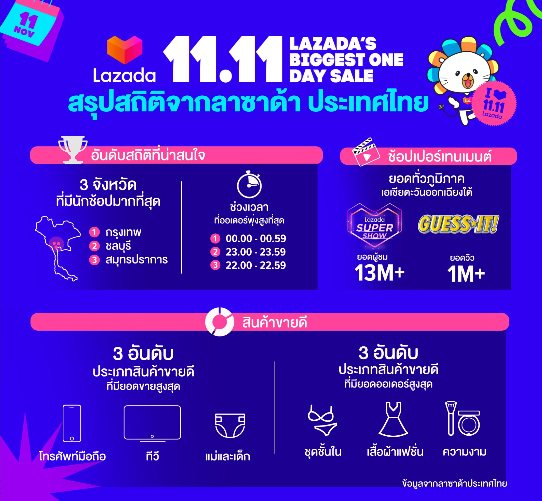 สถิติที่น่าสนใจสำหรับ Lazada 11.11 Biggest One Day Sale วันเดียวได้ทุกดีล พบว่า มือถือยังเป็นสินค้าที่ได้รับความนิยมสูงสุด โดยมียอดขายรวมสูงที่สุดในแคมเปญ 11.11 โดยประเภทสินค้าที่ขายดี 3 อันดับแรก ในแง่ยอดขายรวม ได้แก่ มือถือและแท็บเล็ต, โทรทัศน์ และสินค้าแม่และเด็ก ในขณะที่ประเภทสินค้าที่ขายดี 3 อันดับแรก ในแง่ออเดอร์รวม ได้แก่ ชุดชั้นใน, เสื้อผ้าแฟชั่น และความงาม