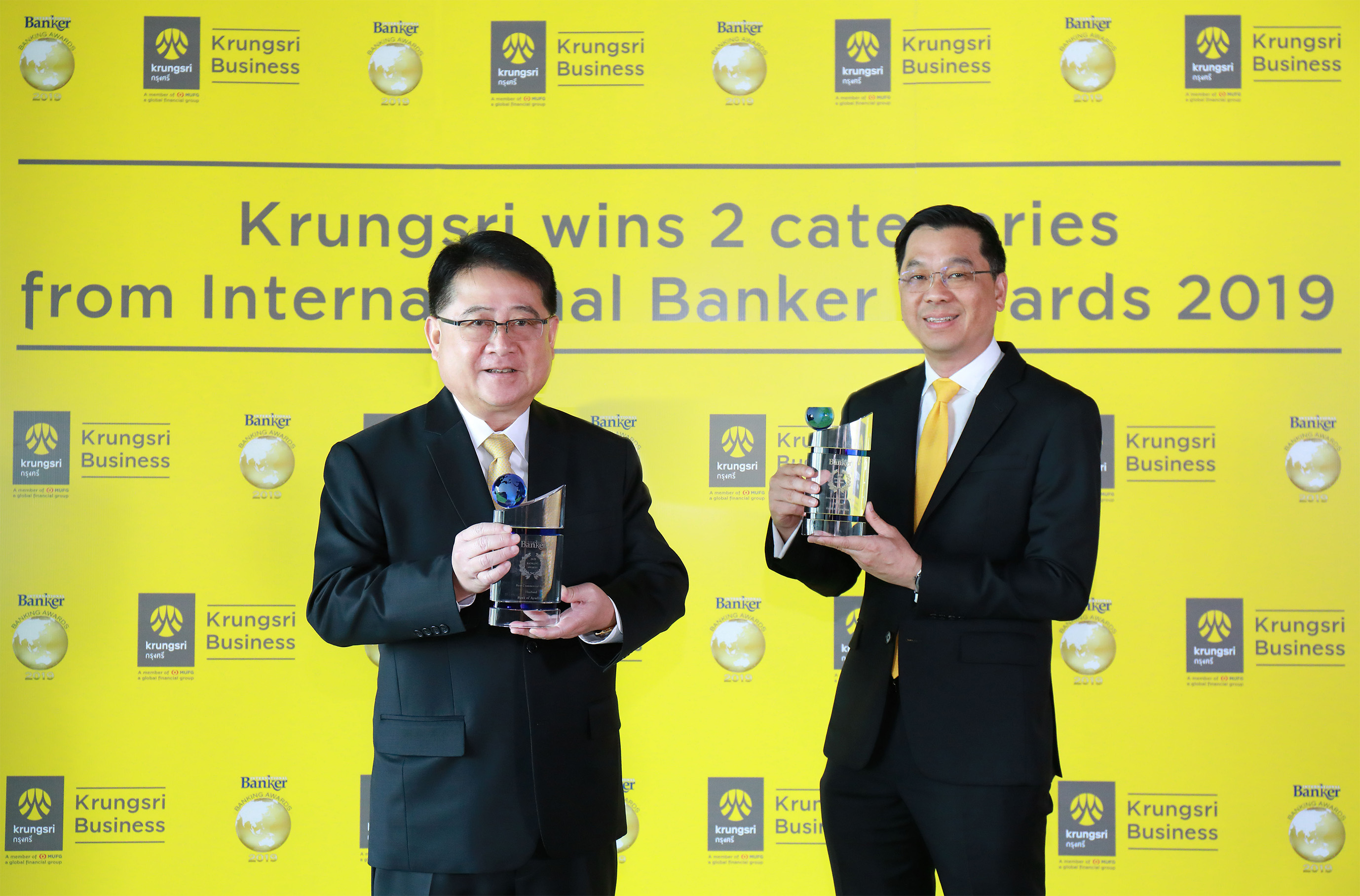 13 พฤศจิกายน 2562 : นายพรสนอง ตู้จินดา (ซ้าย) ประธานกลุ่มธุรกิจลูกค้าธุรกิจ ธนาคารกรุงศรีอยุธยา จำกัด (มหาชน) รับรางวัล Best Commercial Bank of the Year จากInternational Banker Awards 2019 ซึ่งจัดโดย International Banker นิตยสารการเงินชั้นนำระดับโลก พร้อมทั้งนายสิทธิไชย มหาคุณ (ขวา) ประธานคณะเจ้าหน้าที่ด้านวาณิชธนกิจ ธนาคารกรุงศรีอยุธยา จำกัด (มหาชน) รับรางวัล Best Investment Bank of the Year