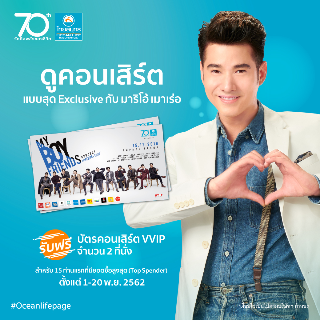 สำหรับลูกค้าที่ซื้อประกันภัยกับ OCEAN LIFE ไทยสมุทร ตั้งแต่วันนี้ – 20 พฤศจิกายน 2562 โดยลูกค้าที่ซื้อประกันภัยและชำระเบี้ยประกันภัยปีแรกงวดแรกไม่ต่ำกว่า 200,000 บาท 15 ท่านแรกที่มียอดซื้อสูงสุด (Top Spender) รับบัตรคอนเสิร์ตที่นั่ง VVIP ท่านละ 2 ใบ พร้อม MEET & GREET กับ มาริโอ้ เมาเร่อ แบรนด์แอมบาสเดอร์ OCEAN LIFE ไทยสมุทร ในบรรยากาศสุด Exclusive ตามเงื่อนไขที่บริษัทฯ กำหนด*