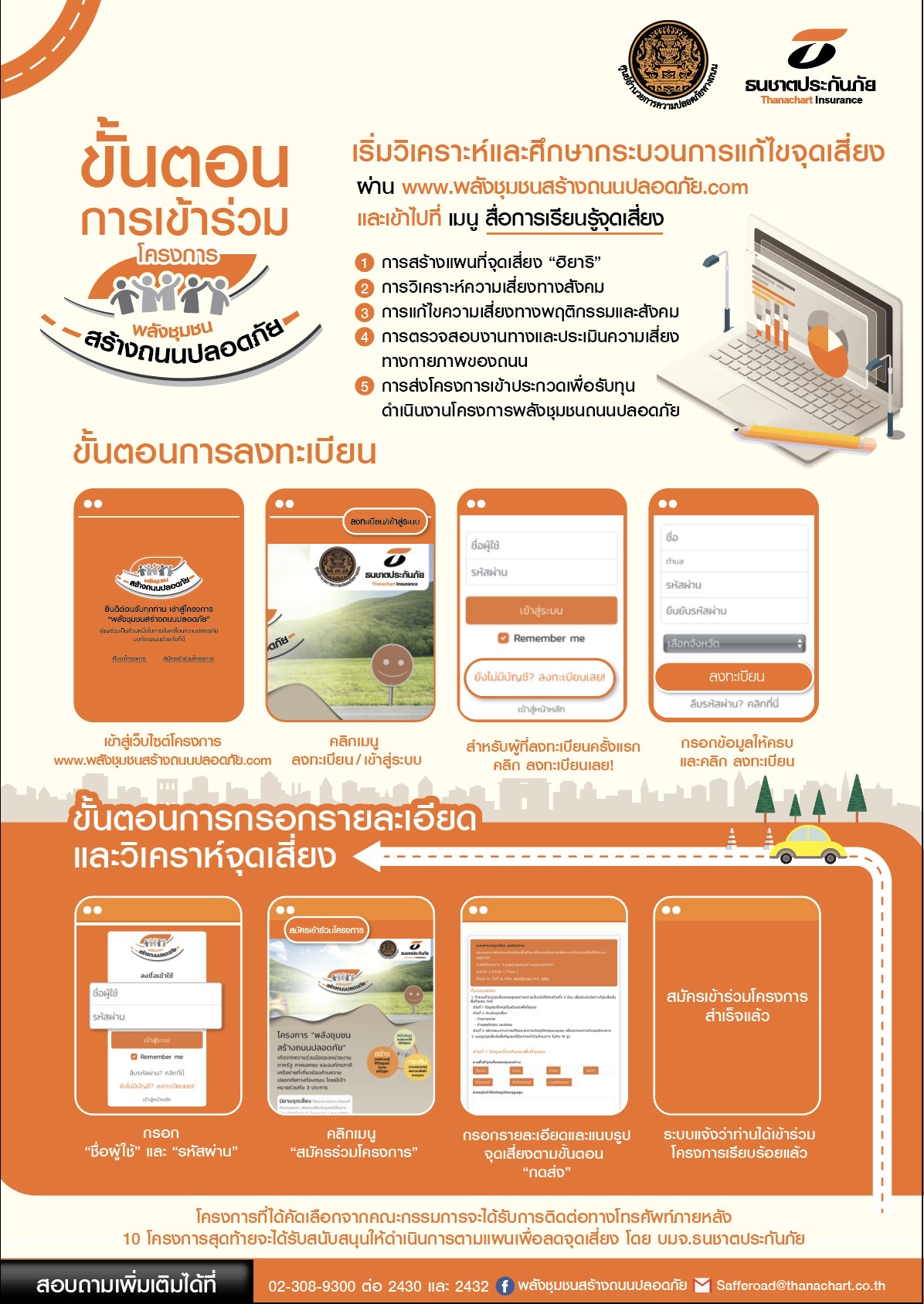 โดยในปีนี้ ธนชาตประกันภัย ร่วมมือกับ ศูนย์อำนวยการความปลอดภัยทางถนน (ศปถ.) วางเป้าหมายให้ชุมชนตื่นตัวและตระหนักถึงปัญหาเพื่อนำไปสู่การร่วมกันสำรวจหาสาเหตุและแนวทางแก้ไขจุดเสี่ยงบนถนนในพื้นที่ของตัวเอง เพื่อลดการเกิดอุบัติเหตุ ลดการสูญเสียของคนในชุมชนและผู้ใช้เส้นทางดังกล่าว ด้วยการเปิดให้ชุมชนทั่วประเทศมีส่วนร่วมสร้างความปลอดภัยบนท้องถนนนำเสนอโครงการวิเคราะห์แก้ไขจุดเสี่ยงในชุมชนของตน โดยใช้หลักการประเมินจากปัจจัยที่ทำให้เกิดความเสี่ยงอุบัติเหตุ ทั้งด้านกายภาพและพฤติกรรมทางสังคม เน้นให้ชุมชนสามารถดำเนินการได้ง่ายๆ
