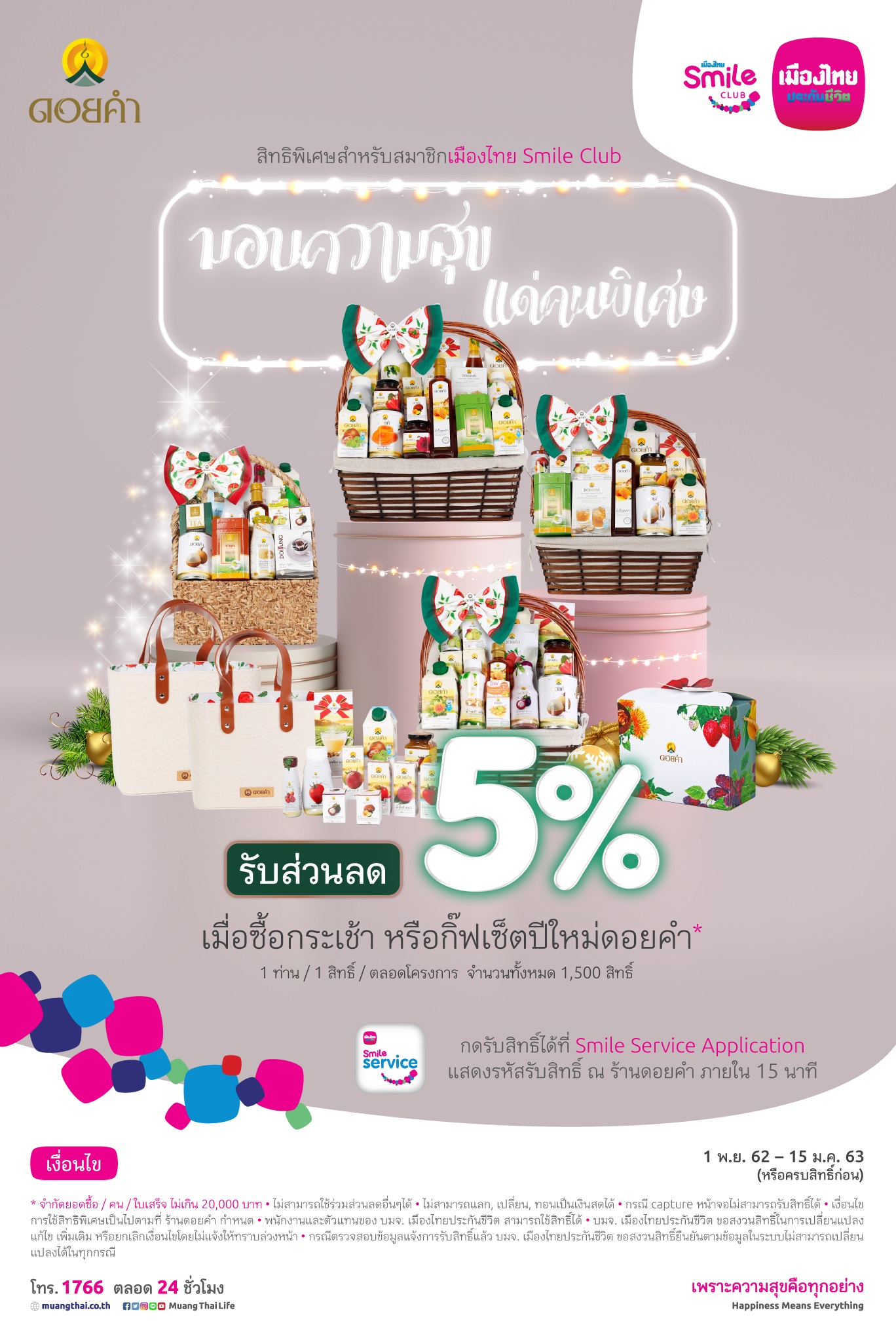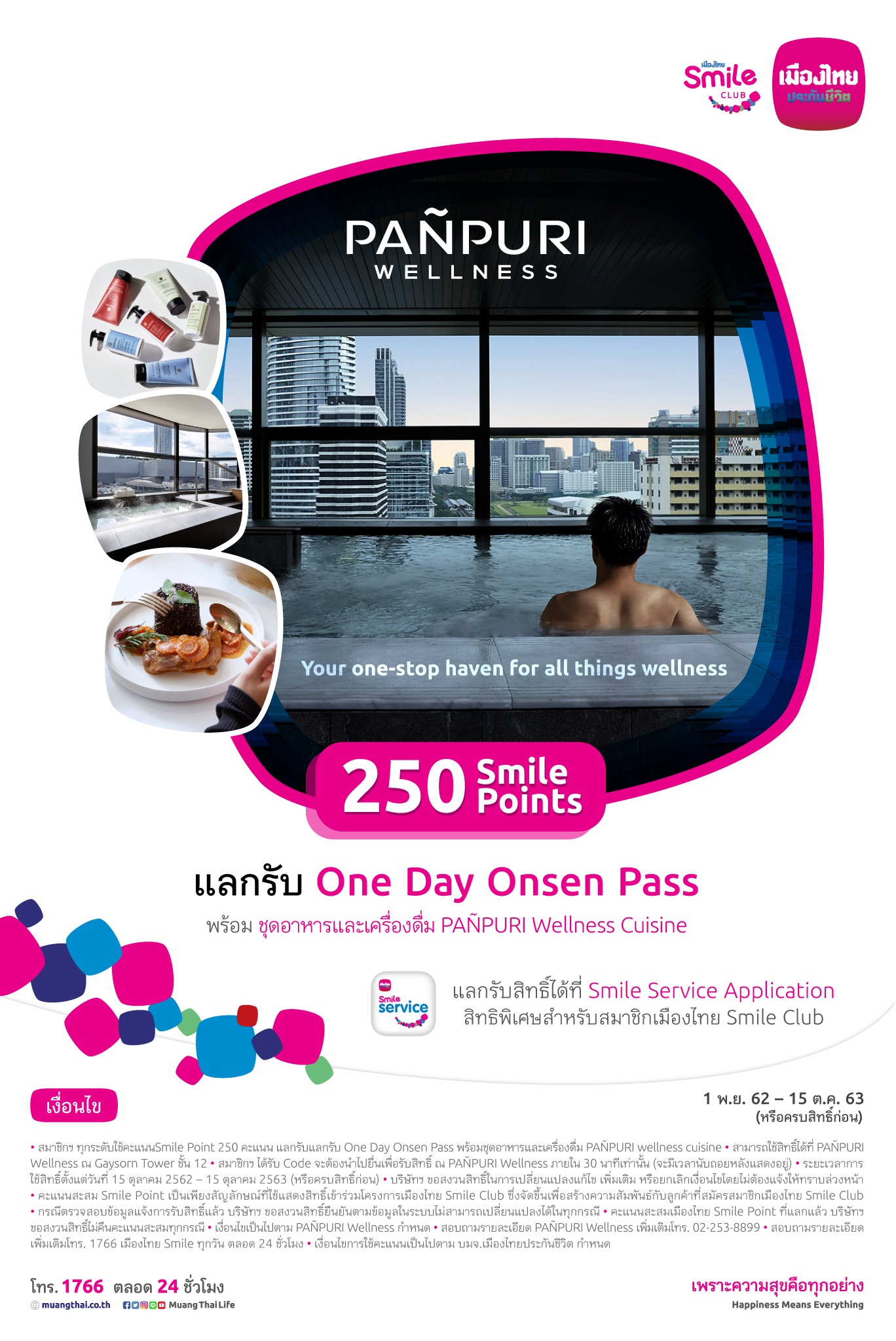 ล่าสุด! เมืองไทย Smile Club ได้เดินหน้าสร้างสรรค์กิจกรรม Onsen Panpuri Wellness ให้สมาชิกฯ ผู้รักสุขภาพใช้คะแนนสะสม Smile Point แลกรับ One Day Onsen Pass พร้อมชุดอาหารและเครื่องดื่ม Panpuri wellness cuisine และกิจกรรม Smile Healthy Redemption ร้านยากรุงเทพ เพียงใช้คะแนนสะสม Smile Point เพื่อรับสิทธิพิเศษ ณ ร้านยากรุงเทพ รวมถึงกิจกรรม กระเช้าดอยคำ มอบความสุขแด่คนพิเศษ รับส่วนลด 5% เมื่อซื้อกระเช้า หรือกิ๊ฟเซ็ตปีใหม่ดอยคำ เพื่อมอบเป็นของขวัญรับปี 2563 สามารถดูรายละเอียดกิจกรรมและสิทธิประโยชน์ต่างๆ เพิ่มเติมได้ที่ www.muangthai.co.th