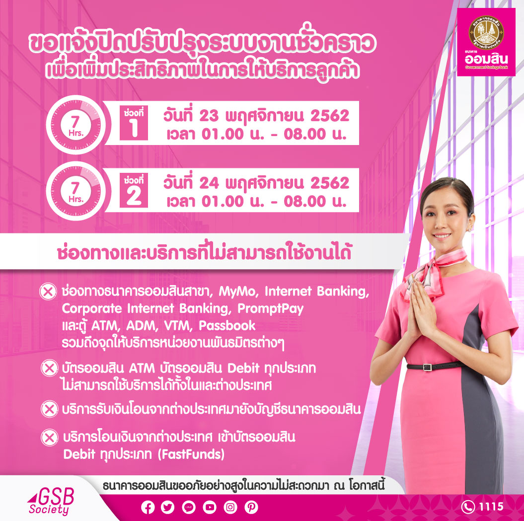 รวมถึงบริการรับโอนเงินจากต่างธนาคารมายังบัญชีธนาคารออมสิน, บริการโอนเงินจากต่างประเทศเข้าบัตรออมสินเดบิตทุกประเภท (FastFunds) และการชำระค่าสินค้าและบริการ (Bill Payment) แบบออนไลน์ ผ่านช่องทาง MyMo และ ATM ได้แก่ การไฟฟ้านครหลวง เงินฝากสงเคราะห์ชีวิต และชำระเงินค่าโทรศัพท์ ไม่สามารถให้บริการชั่วคราวได้เช่นกัน ธนาคารจึงขออภัยลูกค้าทุกท่านในความไม่สะดวกในครั้งนี้ด้วย ![]()
