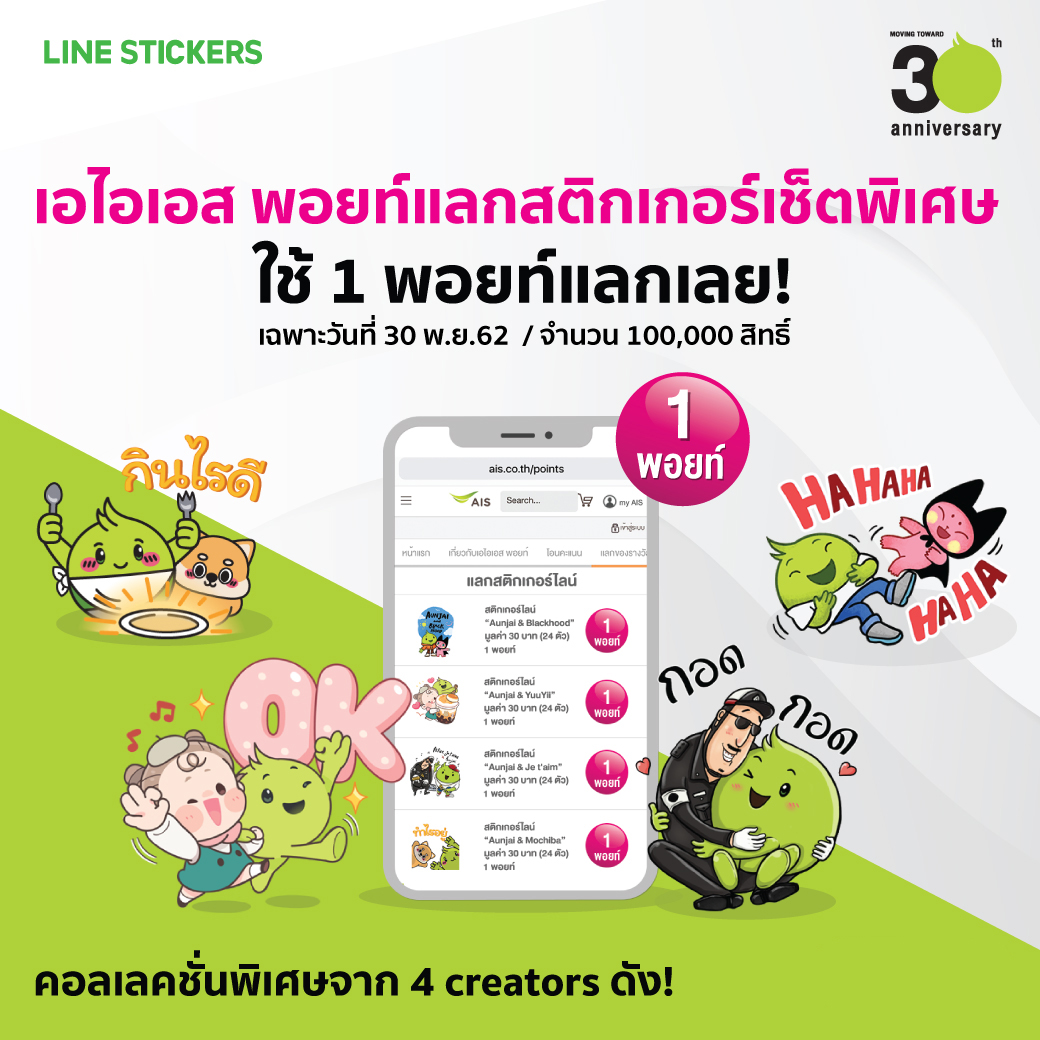 เดินเครื่อง ขยายความสุขต่อเนื่องให้ลูกค้าทั้งฐาน จัดเต็มโบนัสพิเศษส่งท้ายปี ในทุกวันที่ 30 ของเดือนพฤศจิกายน และธันวาคม 2562 นี้ ลูกค้า AIS และ AIS Fibre สามารถใช้เพียง 1 พอยท์แลกรับสิทธิพิเศษสุดเอ็กซ์คลูซีฟ ประเดิม วันที่ 30 พฤศจิกายน 2562 ให้ใช้ 1 พอยท์แลกรับสติ๊กเกอร์ไลน์อุ่นใจ Limited Edition ที่ออกแบบโดย 4 ครีเอเตอร์ไทย ได้แก่ YuuYii’s Daily life, Plug & Pudgy, Animal Addict และ ชีวิตประจำวันของ boba pug โดย 1 หมายเลข / 1 สิทธิ์ / 1 คอลเลคชัน ทั้งนี้ ลูกค้า AIS และ AIS Fibre ที่ยังไม่ได้สมัครเข้าร่วมโครงการ AIS Points สามารถสมัครง่ายๆ ได้แล้ววันนี้ เพียงกด *550# แล้วโทรออก พร้อมรับพอยท์พิเศษ จำนวน 10 พอยท์ทันที