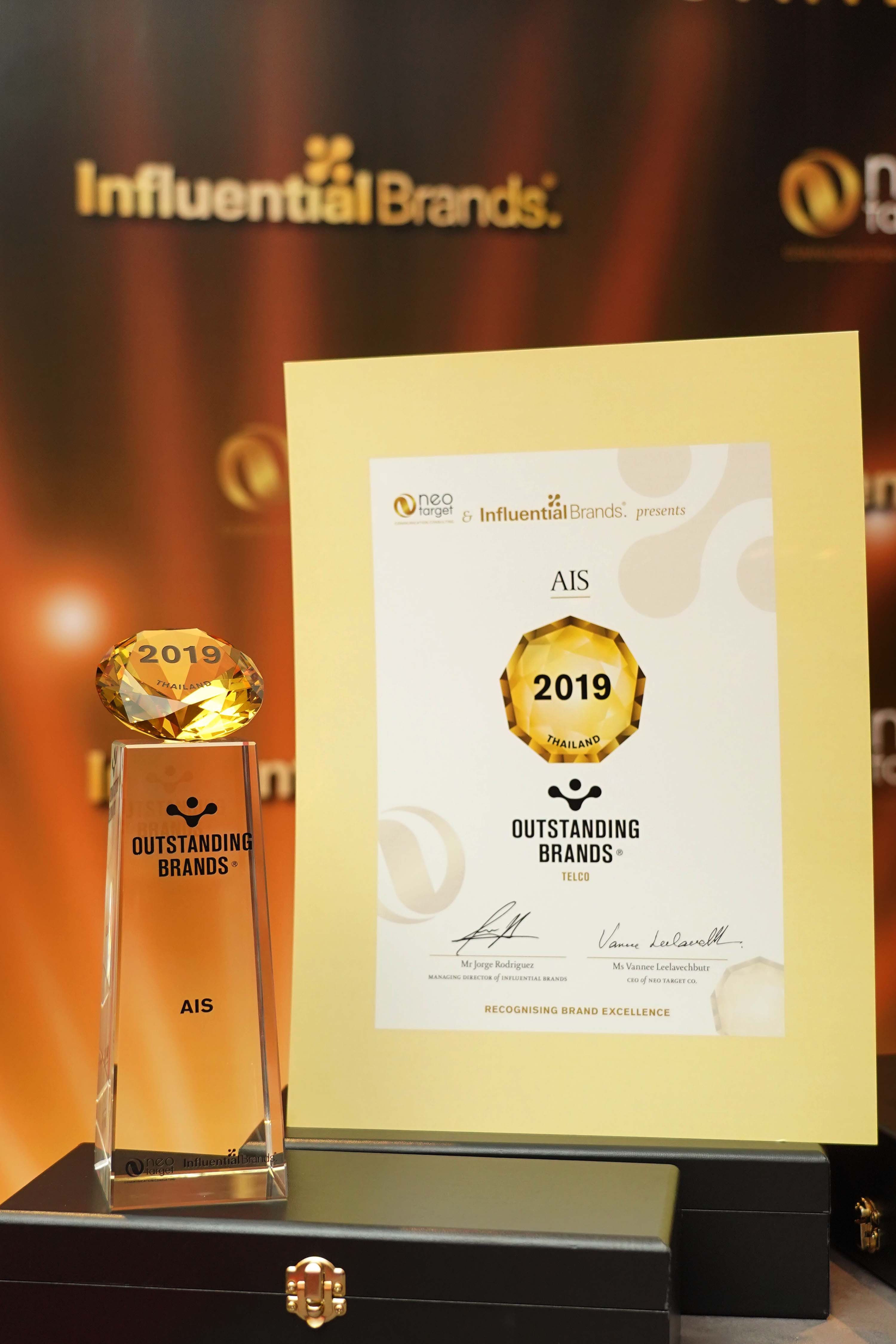 21 พฤศจิกายน 2562 : AIS โดยนางศิวลี บูรณสงคราม หัวหน้าแผนกงานบริหารแบรนด์ รับรางวัล Outstanding Brand รางวัลองค์กรที่โดดเด่นประจำปี ในงานประกาศรางวัล 2019 Asia’s CEO Summit & Award Ceremony ในฐานะองค์กรที่มีความโดดเด่นเป็นที่น่าจับตามองในกลุ่มธุรกิจ ในประเทศต่างๆ ทั่วเอเชีย จัดขึ้นโดยอินฟลูเอ็นเชี่ยล แบรนด์ ประเทศสิงคโปร์ องค์กรวิจัยด้านการตลาดที่ความเชี่ยวชาญในการสร้างแบรนด์สินค้าทั่วเอเชียมากว่า 20 ปี ร่วมกับนิโอ ทาร์เก็ต บริษัทที่ปรึกษาด้านการสื่อสารการสร้างชื่อเสียงและการสื่อสารแบบครบวงจร