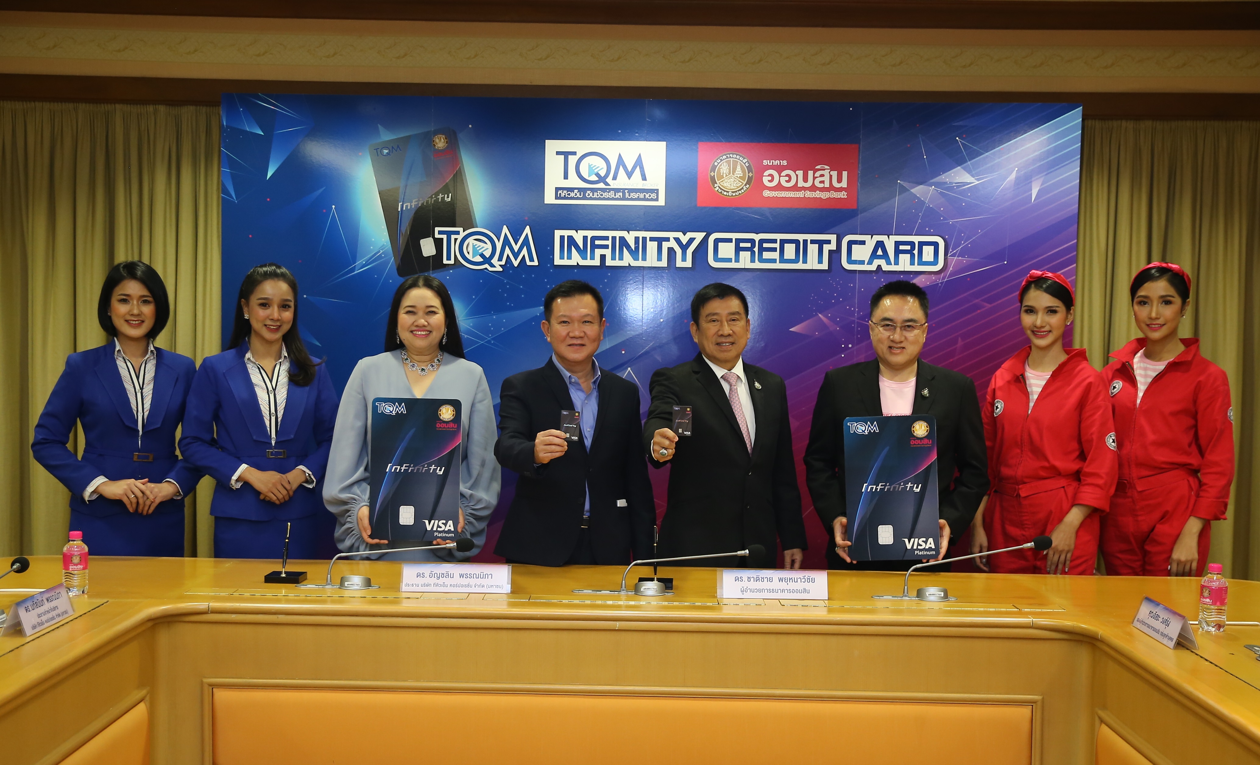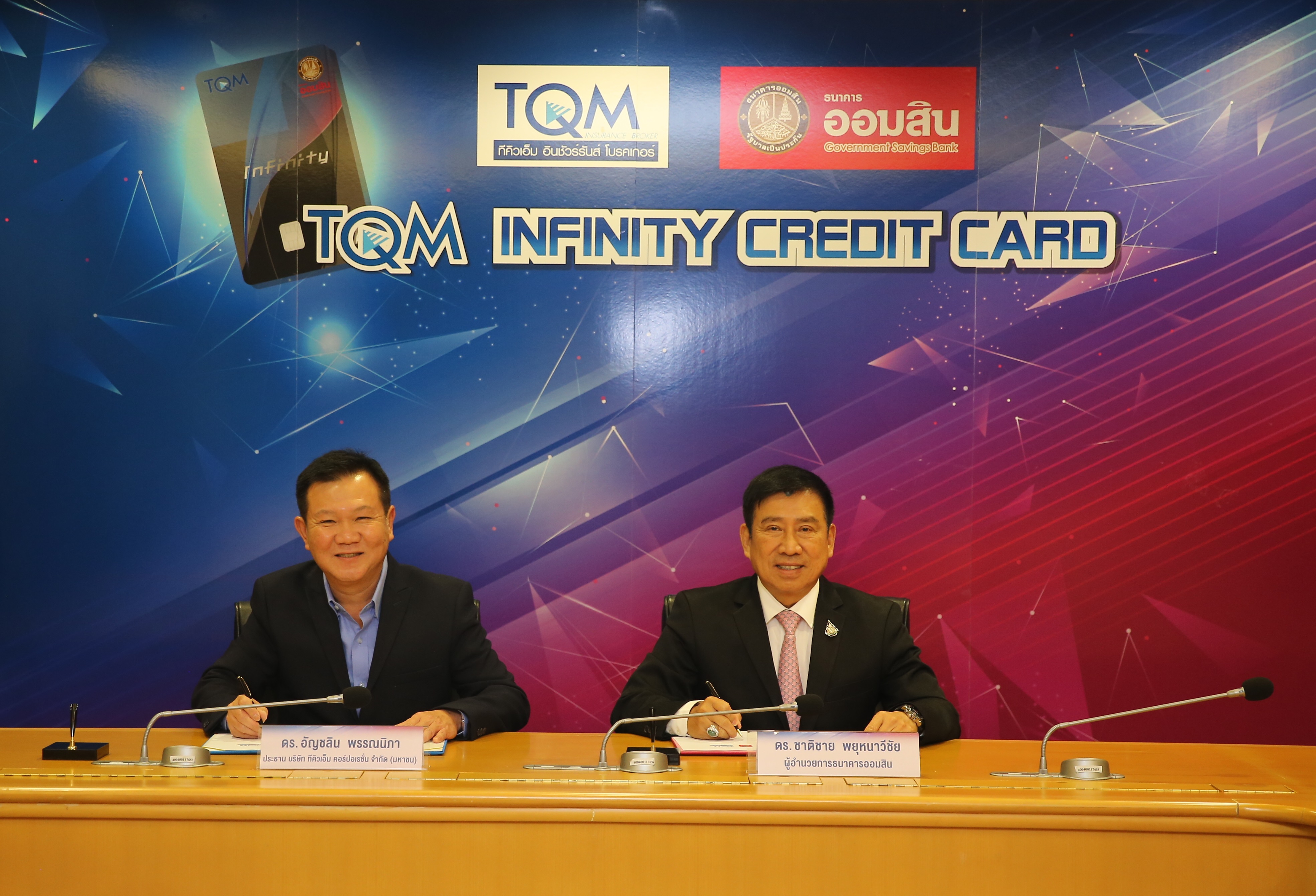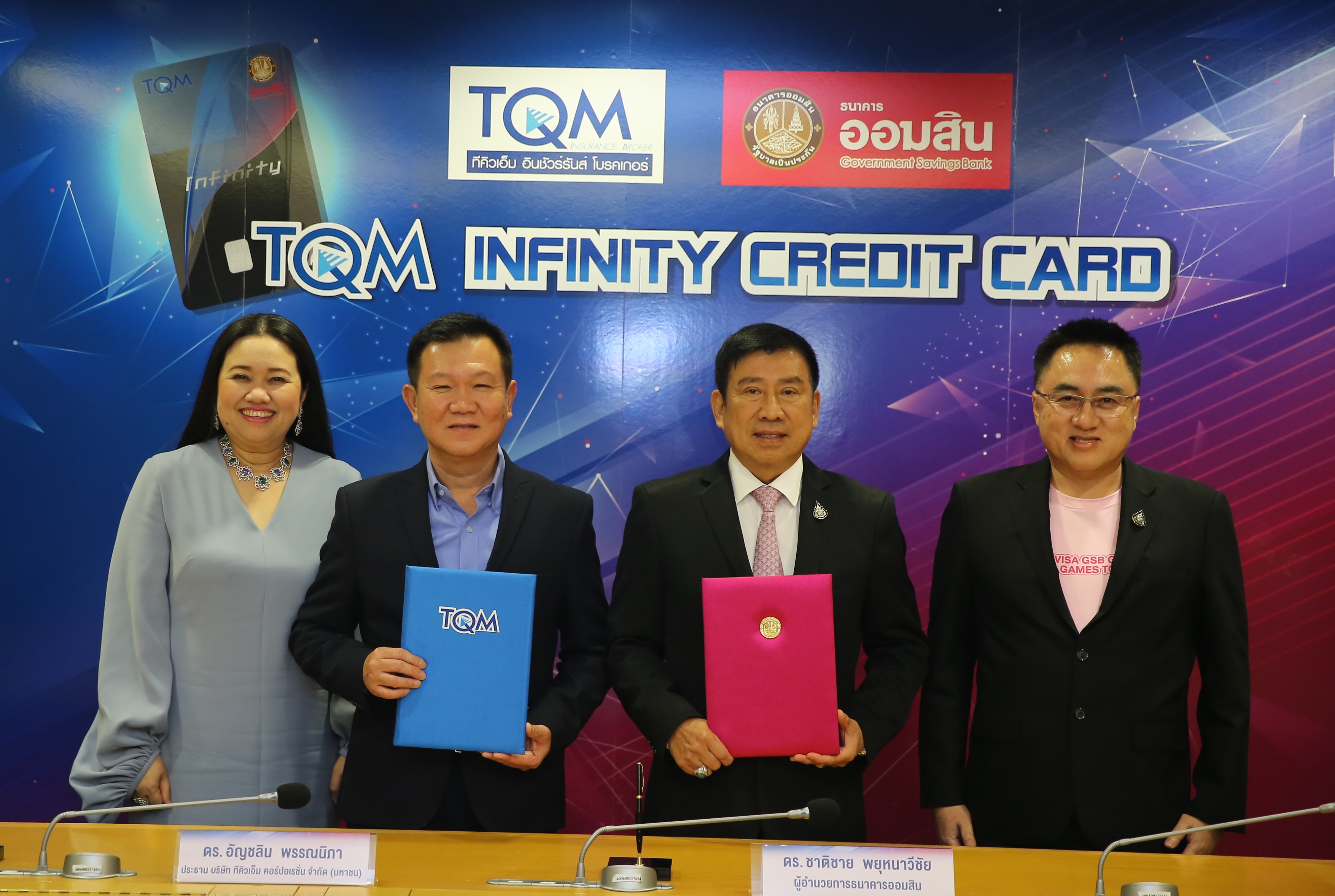 19 พฤศจิกายน 2562 : ดร.ชาติชาย พยุหนาวีชัย ผู้อำนวยการธนาคารออมสิน และ ดร.อัญชลิน พรรณนิภา ประธานบริษัท ทีคิวเอ็ม คอร์ปอเรชั่น จำกัด (มหาชน) ลงนามบันทึกความร่วมมือทางธุรกิจ เพื่อร่วมกันออกผลิตภัณฑ์บัตรเครดิตธนาคารออมสินร่วม หรือ บัตร Co-Brand ในชื่อ บัตร “TQM Infinity Credit Card” ซึ่งจะเป็นอีกหนึ่งบัตรที่อยู่ในตระกูลบัตรอิเล็กทรอนิกส์ของธนาคารออมสิน ที่นำเสนอบริการและสิทธิประโยชน์ต่างๆ มากมายให้แก่ลูกค้าที่สมัครบัตร “TQM Infinity Credit Card” และใช้บริการตั้งแต่วันที่ 18 พฤศจิกายน 2562 – 31 มกราคม 2563
