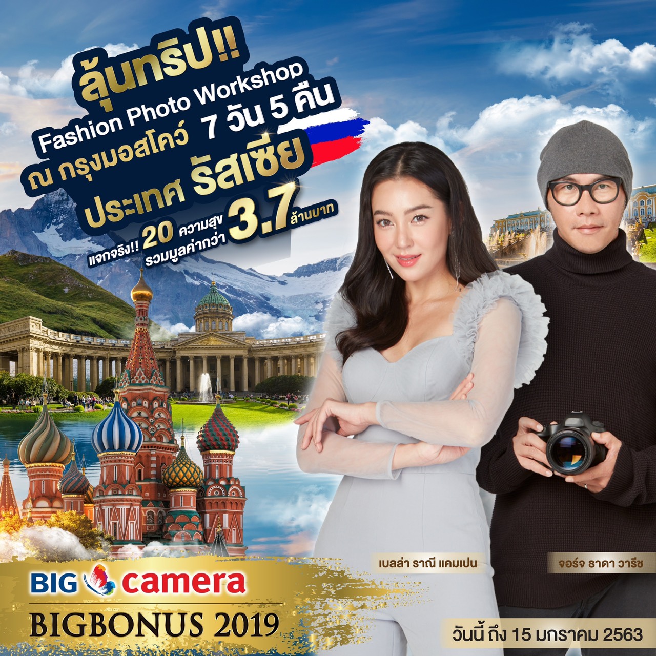 สำหรับไฮไลท์ของแคมเปญ “บิ๊ก คาเมร่า บิ๊ก โบนัส 2019” ในครั้งนี้นอกจากจะเป็นการมอบโบนัสใหญ่ให้แก่กลุ่มลูกค้าแล้ว ยังเป็นการเปิดโอกาสให้คนรักการถ่ายภาพได้ร่วมออกค้นหาประสบการณ์การถ่ายภาพที่ประเมินค่าไม่ได้กับการลุ้นรับสิทธิ์เป็นหนึ่งในผู้โชคดี ร่วมทริปท่องเที่ยวสุดเอ็กซ์คลูซีฟ ณ กรุงมอสโก ประเทศรัสเซีย 7 วัน 5 คืน จำนวน 20 รางวัล มูลค่ารวมกว่า 3.7 ล้านบาท