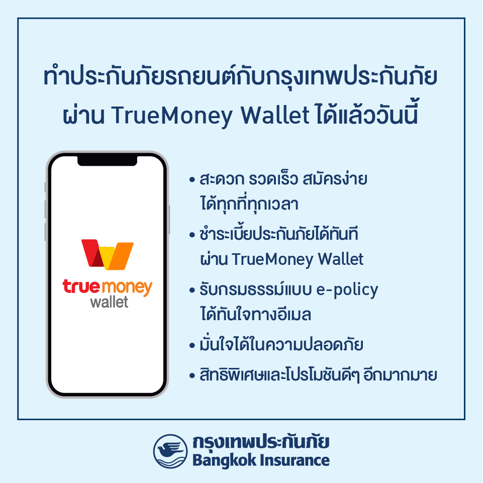 25 พฤศจิกายน 2562 : บริษัท กรุงเทพประกันภัย จำกัด (มหาชน) หรือ BKI ร่วมกับ บริษัท ทรู มันนี่ จำกัด ผู้ให้บริการแอปพลิเคชัน True Money Wallet เพิ่มความสะดวกรวดเร็วให้แก่ลูกค้าที่ต้องการทำประกันภัยรถยนต์กับกรุงเทพประกันภัย ด้วยการเปิดให้บริการทำประกันภัยรถยนต์ออนไลน์พร้อมชำระเบี้ยประกันภัยผ่านแอปพลิเคชัน True Money Wallet ได้ตั้งแต่วันนี้เป็นต้นไป