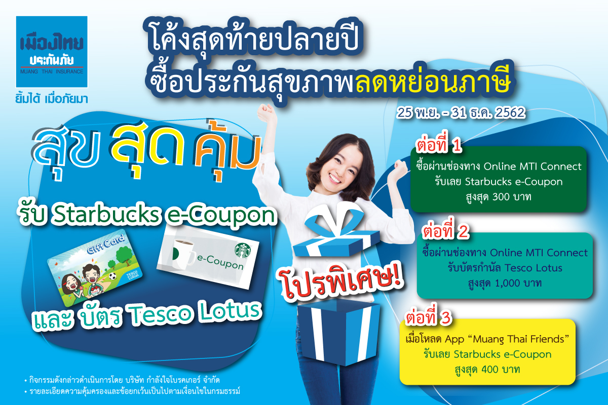 สำหรับกิจกรรมดังกล่าวดำเนินงานโดย บริษัท กำลังใจ โบรคเกอร์ จำกัด (รายละเอียดความคุ้มครองและข้อยกเว้นเป็นไปตามเงื่อนไขในกรมธรรม์) ส่วนลูกค้าที่จะแจ้งความประสงค์ใช้สิทธิยกเว้นภาษีเงินได้ตามกฎหมายว่าด้วยภาษีอากรรวมถึงประสงค์ดาว์นโหลดเอกสารประกอบการยื่นลดหย่อนภาษีสามารถลงทะเบียนออนไลน์ผ่านช่องทางเว็บไซต์บริษัทฯ ได้ ลูกค้าเมืองไทยประกันภัยสามารถดาว์นโหลด App Muang Thai Friends ให้คุณไม่พลาดทุกการเติมสุขในทุกสิทธิพิเศษ