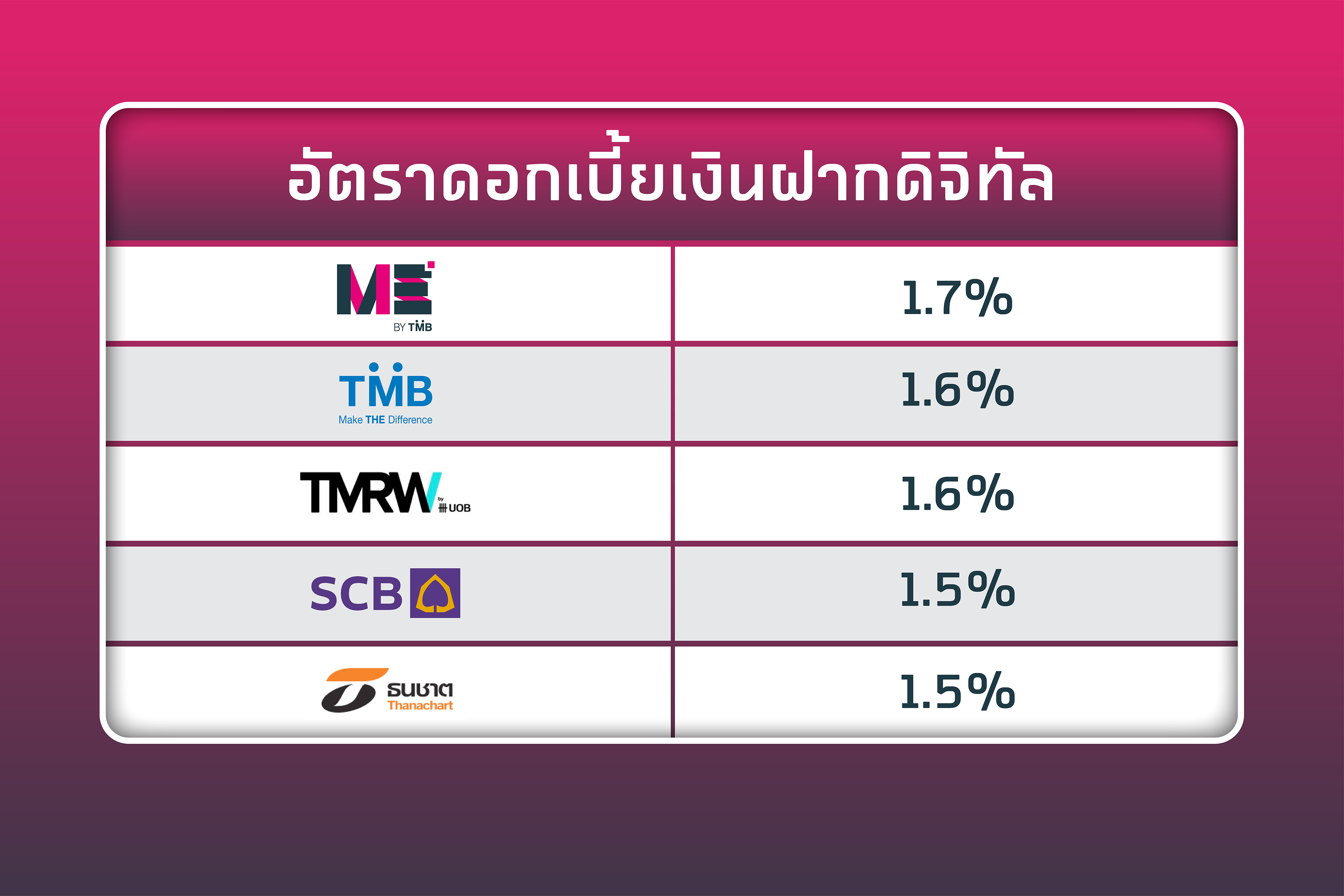 จากการสำรวจข้อมูลอัตราดอกเบี้ยทางหน้าเว็บไซต์ของดิจิทัลแบงก์กิ้ง 4-5 รายของไทยตอนนี้ หลังประกาศปรับลดอัตราดอกเบี้ยลงแล้ว แอดมินขอสรุปไว้ให้เผื่อจะมีบัญชีไหนน่าสนใจให้โยกเงินไปฝากในช่วงดอกเบี้ยขาลงดังนี้