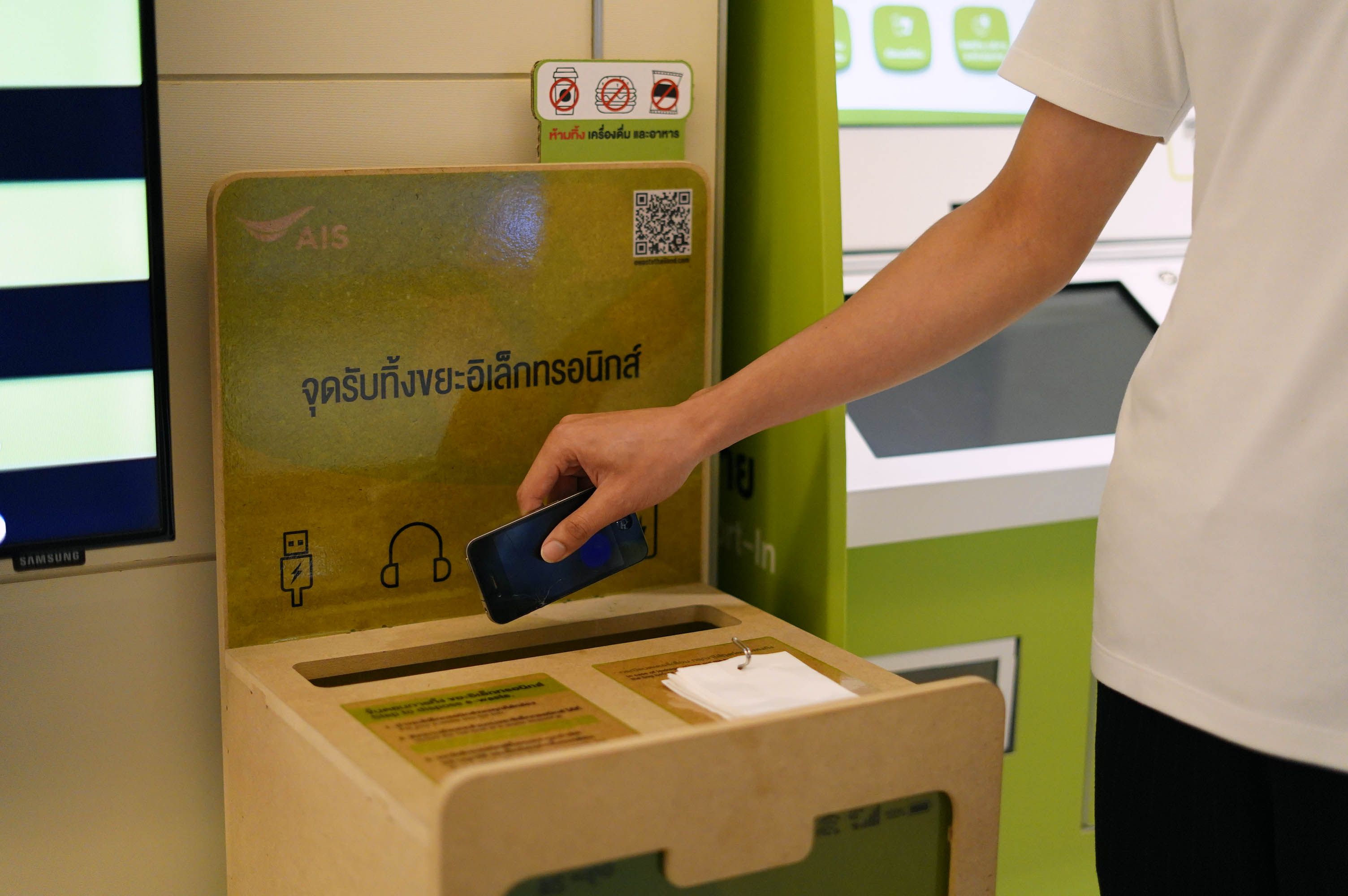 สะดวกให้ประชาชนสามารถนำโทรศัพท์มือถือ แบตเตอรี่มือถือ พาวเวอร์แบงก์ สายชาร์จ หูฟังที่ไม่ใช้แล้ว มาทิ้งได้ที่ถังขยะ E-Waste ที่เอไอเอสช็อปทั่วประเทศและศูนย์การค้าของ CPN พร้อมทั้งสร้างการตระหนักรู้กับพนักงานโดยการตั้งจุดรับทิ้งขยะอิเล็กทรอนิกส์ไว้ที่สำนักงานใหญ่ทุกภูมิภาคและยังได้จัดกิจกรรมใหญ่ “กรีน พหลโยธิน” เครือข่ายรณรงค์รับทิ้งขยะอิเล็กทรอนิกส์ E-Waste จากหน่วยงานและประชาชนตลอดเส้นถนนพหลโยธิน สร้างโมเดลต้นแบบเมืองสีเขียว ที่สามารถ คัดแยก และกำจัดขยะอิเล็กทรอนิกส์ E-Waste ได้อย่างถูกวิธี
