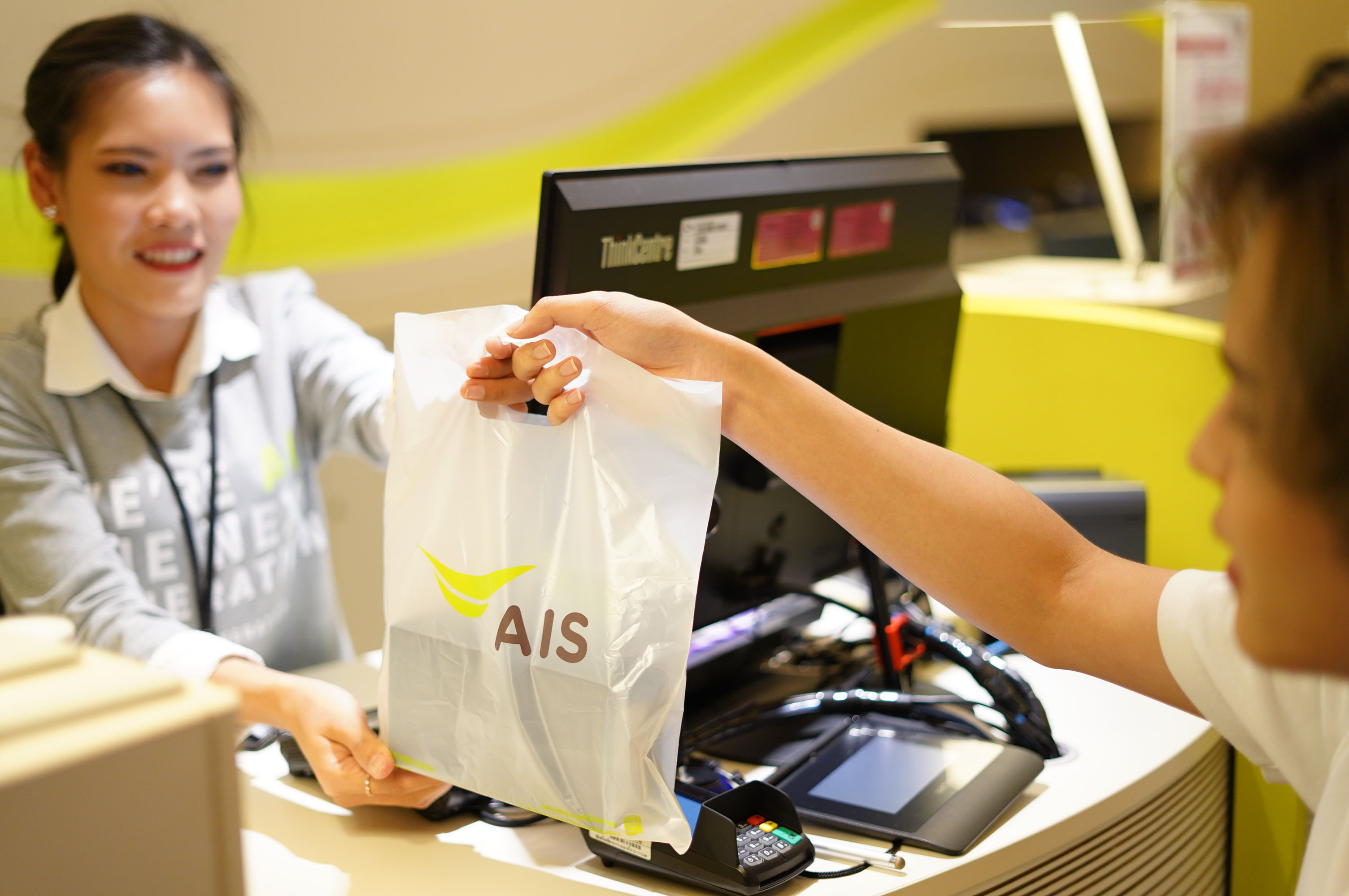 ในส่วนของจุดบริการลูกค้า เอไอเอสช็อป และเซเรเนดคลับทุกสาขา ได้เปลี่ยนขวดน้ำ หลอด และแก้ว จากเดิมที่เป็นพลาสติก เป็นวัสดุจากธรรมชาติ เช่น ชานอ้อยหรือไม้ รวมถึงเปลี่ยนไปใช้ถุงพลาสติกชีวภาพที่ผลิตจากพืช ซึ่งได้รับเครื่องหมายรับรอง GC Compostable บ่งบอกถึงผลิตภัณฑ์ที่เป็นมิตรต่อสิ่งแวดล้อมและสามารถสลายตัวได้ตามธรรมชาติ