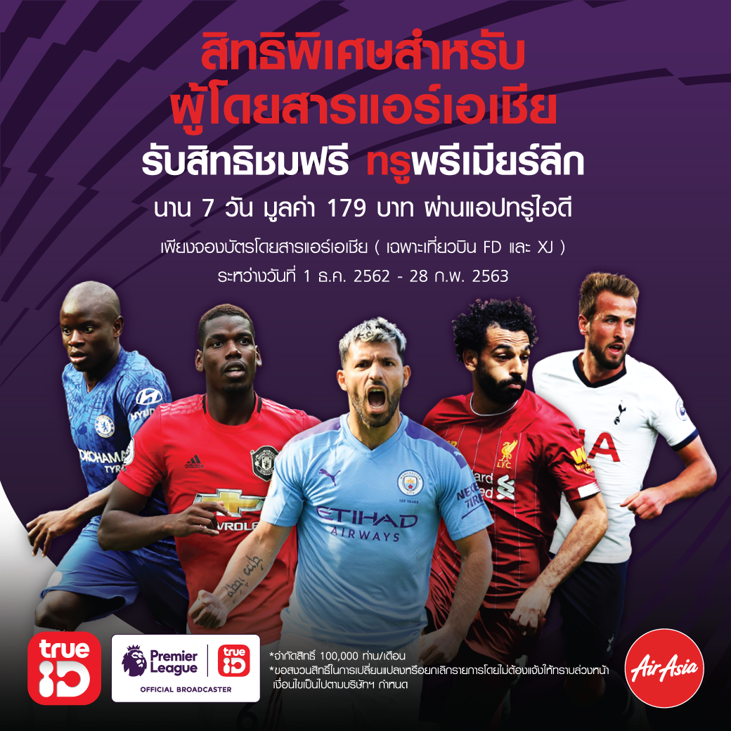 6 ธันวาคม 2562 : ทรูไอดีเติมเต็มชีวิตดิจิทัล ครบจบทุกไลฟ์สไตล์ ร่วมกับสายการบินแอร์เอเชียพร้อมเอาใจคอบอล มอบสิทธิพิเศษแก่ผู้โดยสารสายการบินแอร์เอเชีย เปิดประสบการณ์ความมันส์ รับสิทธิ์ชมฟรี ทรูพรีเมียร์ลีก นาน 7 วัน มูลค่า 179 บาท สำหรับชมผ่านแอปพลิเคชัน ทรูไอดี เมื่อจองบัตรโดยสารแอร์เอเชียระหว่างวันที่ 1 ธันวาคม 2562 – 28 กุมภาพันธ์ 2563 เท่านั้น (เฉพาะเที่ยวบินไทยแอร์เอเชีย FD และไทยแอร์เอเชีย เอ็กซ์ XJ) ติดตามรายละเอียดเพิ่มเติมได้ที่ http://bit.ly/TrueIDxAirasia หรือ Facebook/ AirAsia (Facebook Note ![]()