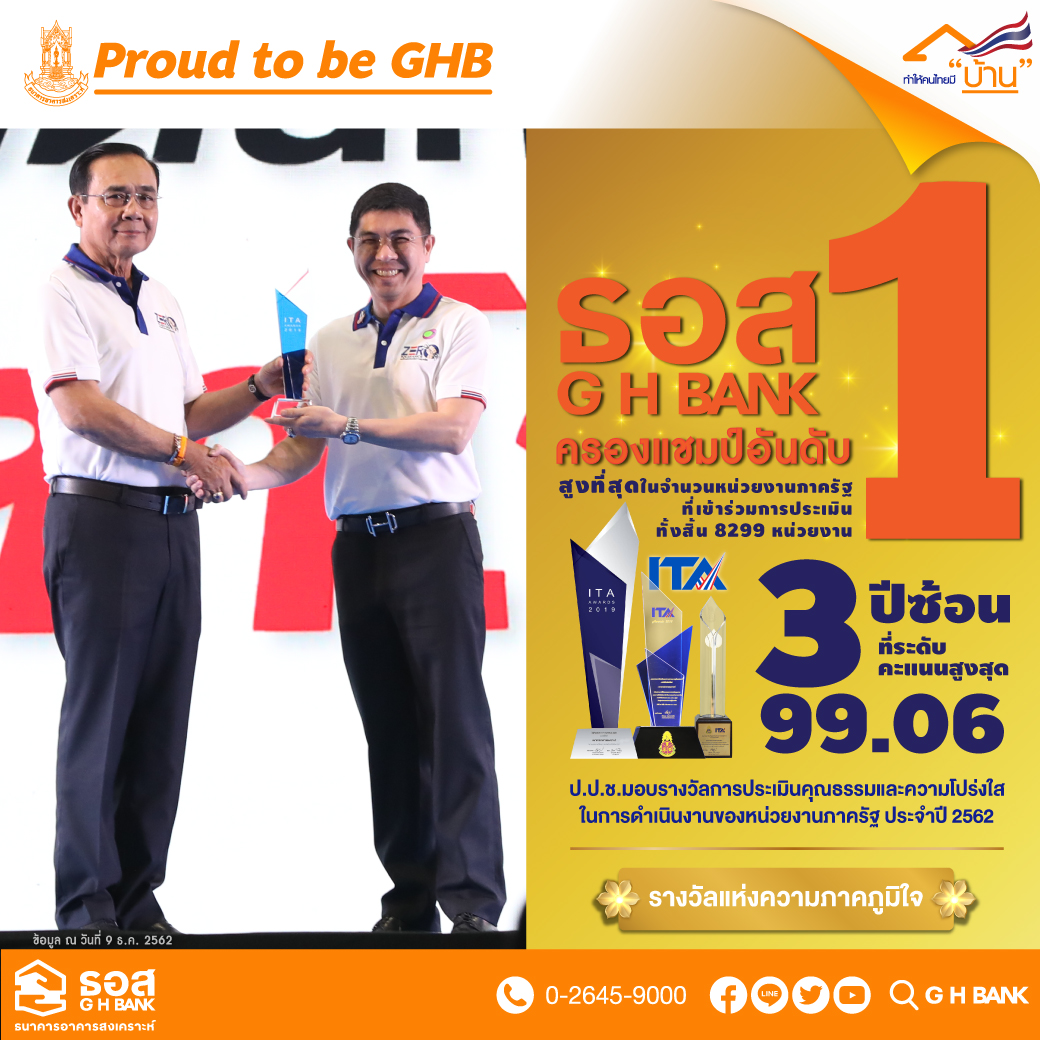 9 ธันวาคม 2562 : นายฉัตรชัย ศิริไล กรรมการผู้จัดการ ธนาคารอาคารสงเคราะห์ (ธอส.) รับรางวัลการประเมินคุณธรรมและ ความโปร่งใสในการดำเนินงานของหน่วยงานภาครัฐ ประจำปีงบประมาณ 2562 (ITA Awards) ในฐานะหน่วยงานที่มีคะแนนสูงสุด จาก 8,299 หน่วยงาน เป็นปีที่ 3 ติดต่อกัน และได้รับคะแนนประเมินสูงที่สุดเป็นอันดับ 1 ที่ 99.06 คะแนน