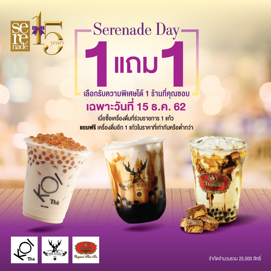 1. Serenade Day ไฮไลท์เด็ดที่ลูกค้าเรียกร้องให้กลับมาอีกครั้ง ซื้อ 1 แถมอีก 1 ชานมไข่มุก 3 ร้านดัง KOI The’ / The Alley และชาตรามือ (เลือกใช้สิทธิ์ได้ 1 เลขหมาย / 1 สิทธิ์ / โครงการ สามารถรับสิทธิ์ได้ ณ สาขาที่ร่วมรายการ)