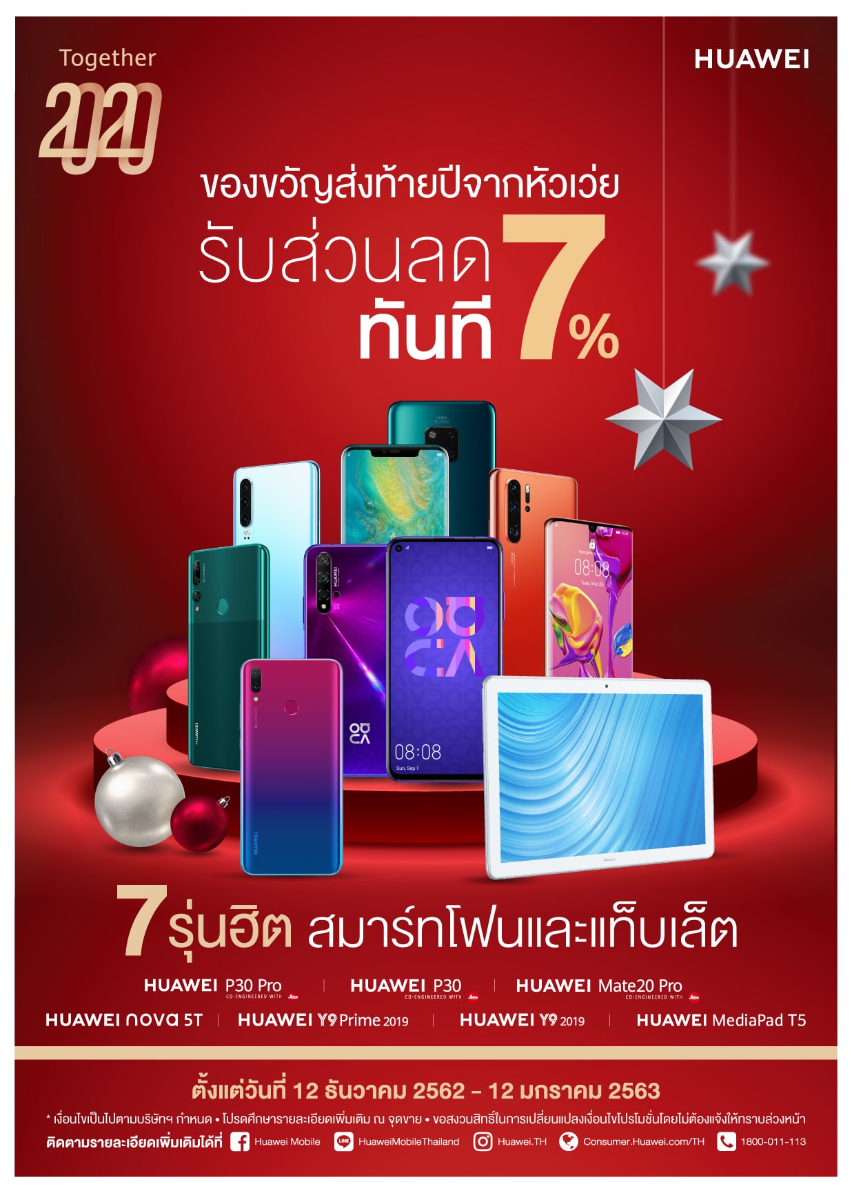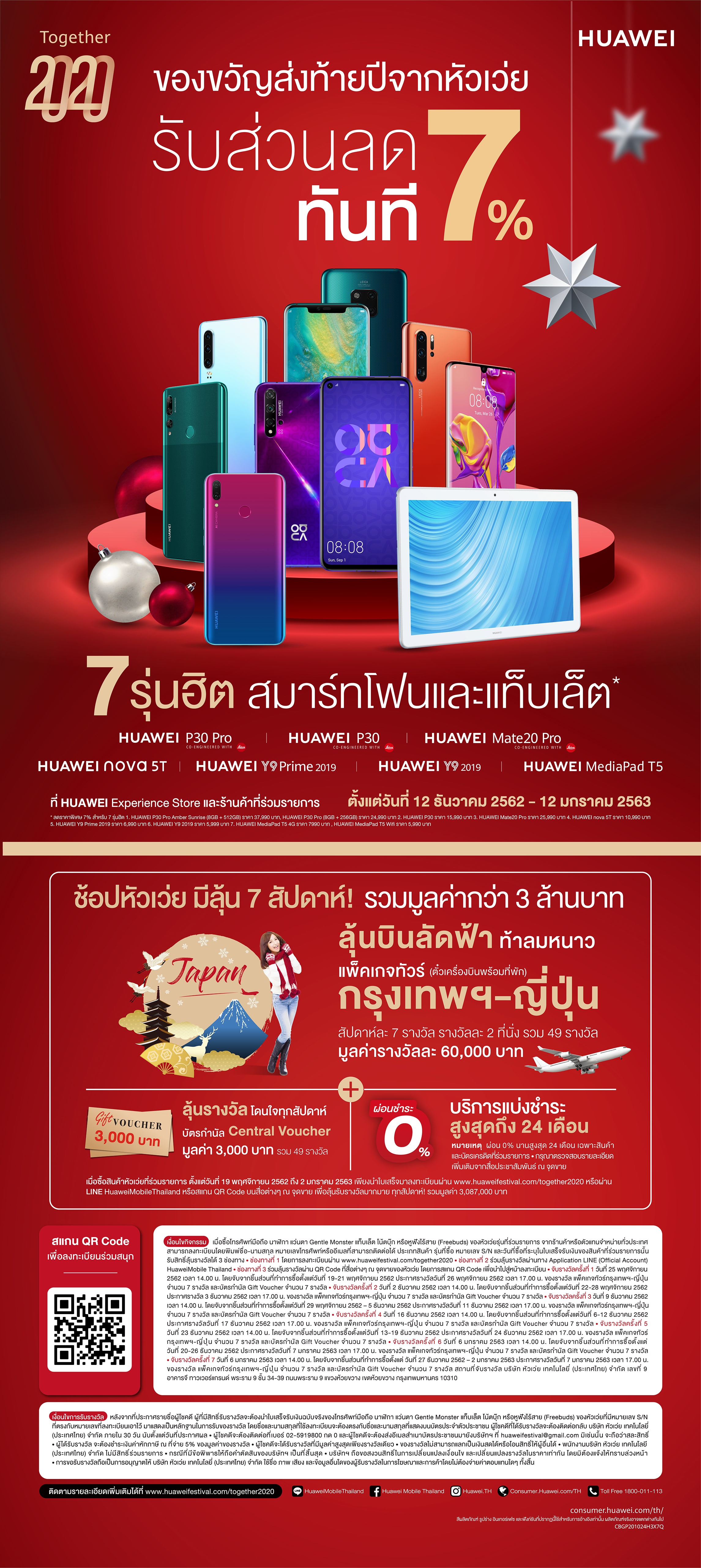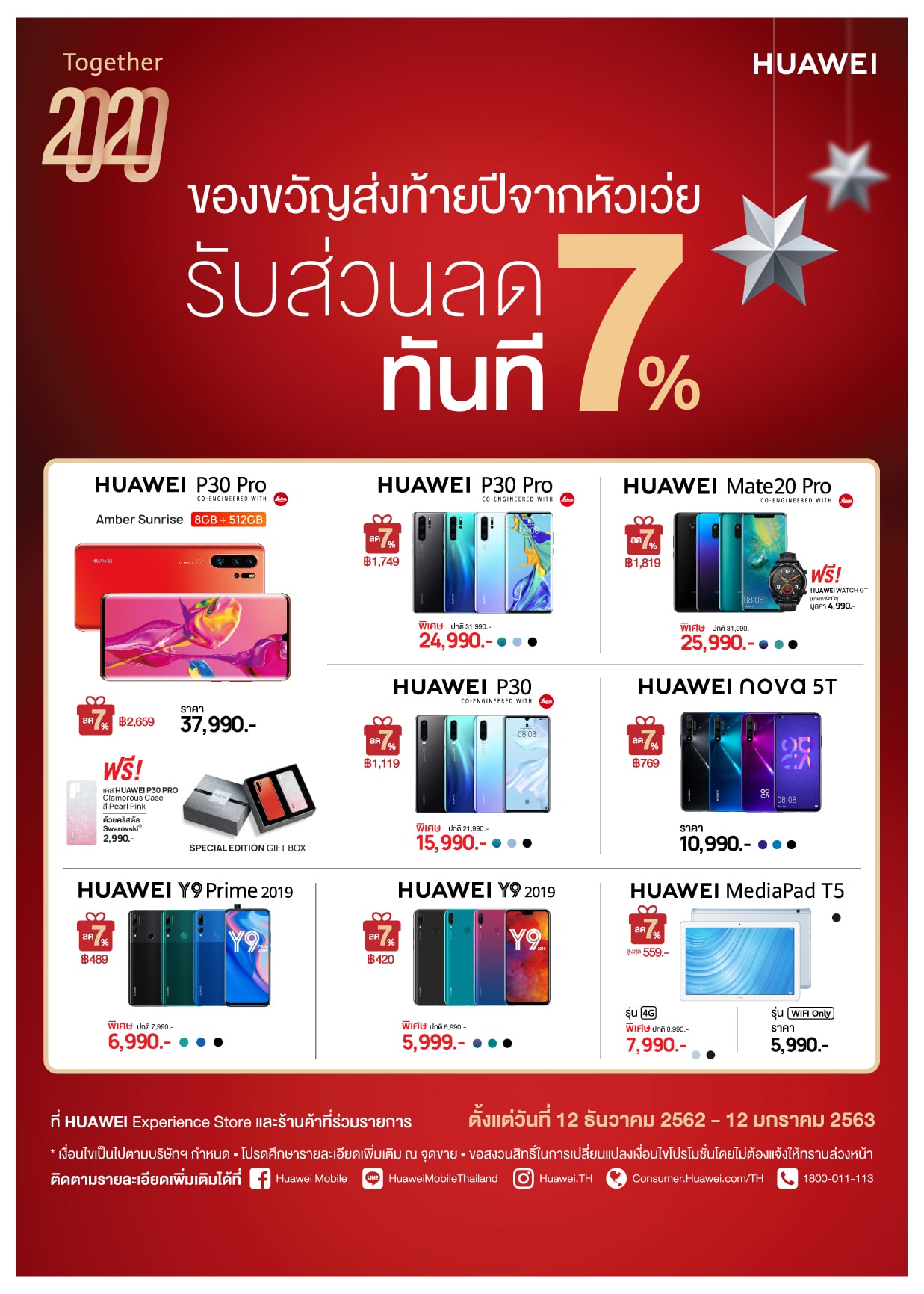 12 ธันวาคม 2562 : หัวเว่ยมอบของขวัญส่งท้ายปี เสริมทัพแคมเปญ “Together 2020” ด้วยส่วนลดเพิ่มทันที 7% สำหรับสมาร์ทโฟนและแท็บเล็ต 7 รุ่นสุดฮิต พร้อมรับสิทธิ์ลุ้นบินลัดฟ้า ท้าลมหนาวกับแพ็กเกจทัวร์ กรุงเทพ-ญี่ปุ่น ทุกสัปดาห์ เริ่มแล้ว วันนี้ ถึง 12 มกราคมนี้ Huawei Experience Store และร้านค้าที่ร่วมรายการ