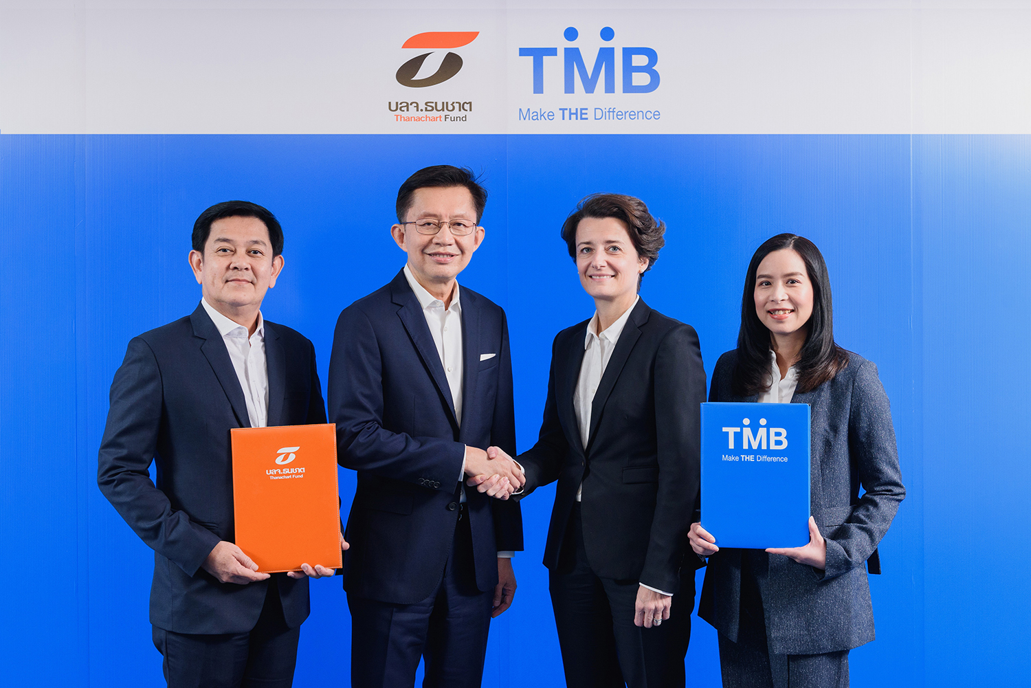 18 ธันวาคม 2562 : ทีเอ็มบี นำโดย มารี แรมลี (ที่ 3 จากซ้าย) ประธานเจ้าหน้าที่บริหารลูกค้ารายย่อย ทีเอ็มบี ตอกย้ำจุดยืนและกลยุทธ์การให้บริการด้านกองทุนแบบ Open Architecture ที่มุ่งมั่นคัดสรรกองทุนดีๆ จากพันธมิตรที่มีความเชี่ยวชาญและมีจุดเด่นในแต่ละประเภททั้งในและต่างประเทศ เพื่อเพิ่มทางเลือกในการลงทุนที่หลากหลาย ให้ลูกค้าได้มีโอกาสได้รับผลตอบแทนที่ดีขึ้น ล่าสุดได้ร่วมกับพันธมิตรรายที่ 11 บริษัทหลักทรัพย์จัดการกองทุน ธนชาต จำกัด นำโดย นายบุญชัย เกียรติธนาวิทย์ (ที่ 2 จากซ้าย) กรรมการผู้จัดการ บริษัทหลักทรัพย์จัดการกองทุน ธนชาต จำกัด