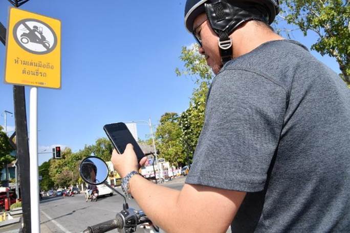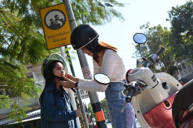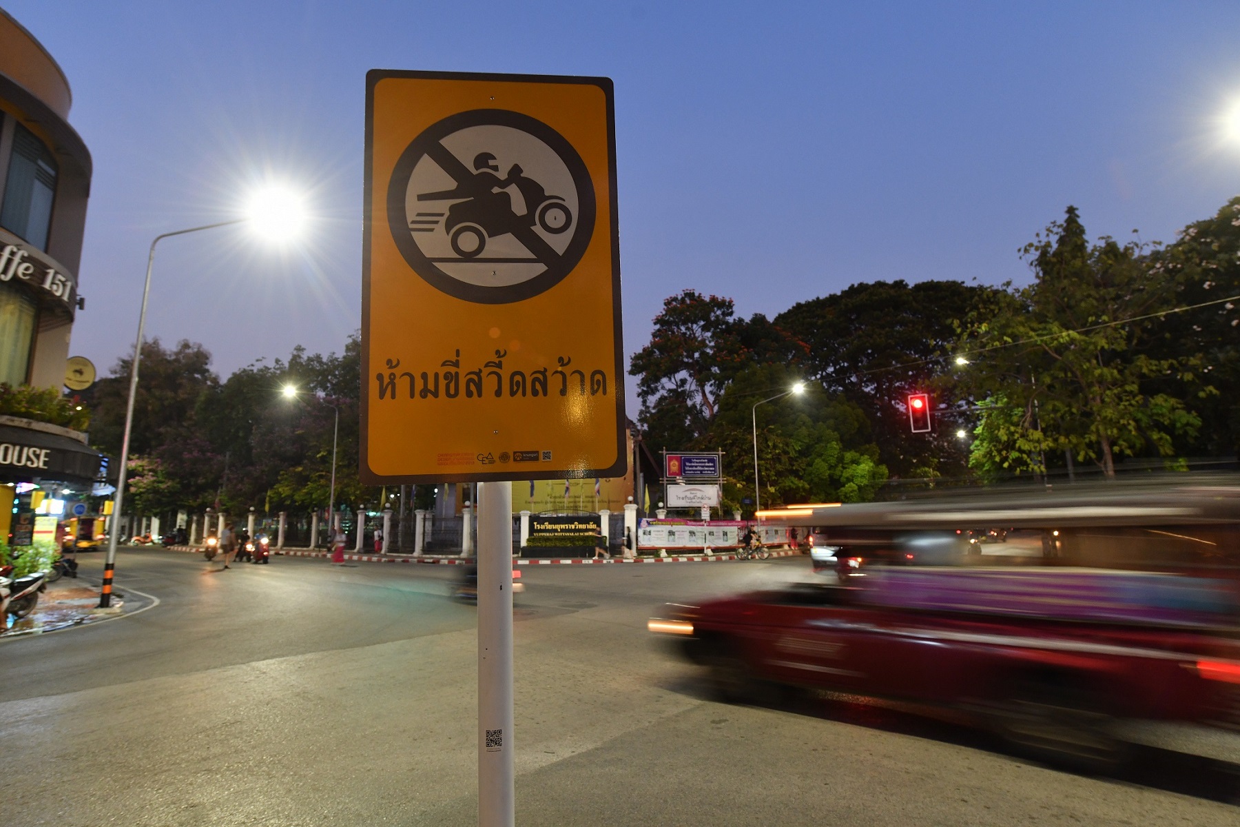 นอกจากนี้ เรายังคำนึงถึง ศาสตร์และศิลป์ของการจัดวาง กราฟิกและข้อความที่ใช้สื่อสารมีความตรงไปตรงมา โดยข้อความบนแผ่นป้ายที่ใช้ในการจัดแสดงครั้งนี้เป็นภาษาเหนือ เนื่องจากพื้นที่การจัดแสดงอยู่ในจังหวัดเชียงใหม่ การใช้ภาษาถิ่นจะช่วยให้ผู้พบเห็นรู้สึกว่าเป็นเรื่องใกล้ตัวมากขึ้น ในขณะที่ตำแหน่งตั้งป้ายจะคำนึงถึงสิ่งแวดล้อมที่สอดคล้องและพฤติกรรมของผู้ขับขี่เป็นหลัก เช่น การติดป้าย ‘ชุบหมวกกันน๊อกหื้อละอ่อน’ ในบริเวณลานจอดรถ แน่นอนว่าคุณพ่อคุณแม่เมื่อได้เห็นป้ายนี้ จะตระหนักถึงความปลอดภัยของลูกขึ้นมาทันทีก่อนที่จะสตาร์ทรถ