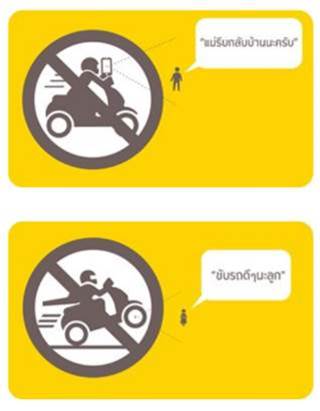 สุดท้ายคือหัวใจของป้าย หากลองสังเกตให้ดี ในทุกๆ ป้าย จะมีจุดสังเกตเล็กๆ ซึ่งเป็นไอค่อนรูปคน ที่เป็นเครื่องหมายแทนคนในครอบครัวเพื่อสื่อสารว่าแท้จริงแล้วทุกแผ่นป้ายเตือนที่พบเห็นโดยทั่วไป ไม่เพียงแต่จะเป็นความห่วงใยจากภาครัฐหรือหน่วยงานต่างๆเท่านั้น หากแต่มีอีกสิ่งสำคัญที่ทุกแผ่นป้ายพยายามจะสื่อสารกับคุณก็คือ พวกเราอยากให้พวกคุณเดินทางอย่างปลอดภัย เพราะยังมีคนที่รักคุณรอคุณอยู่ที่บ้าน” นายพรเทพ กล่าวเสริม