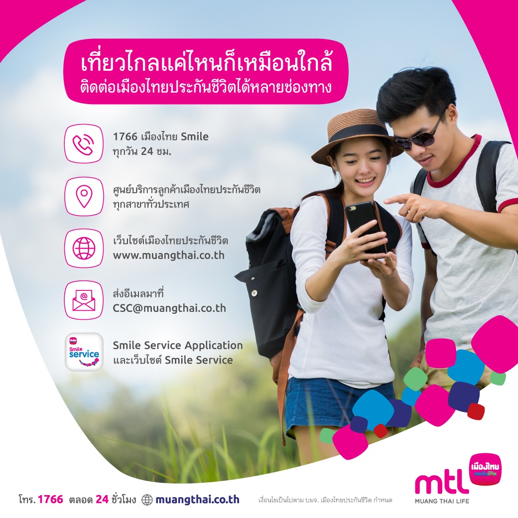 ศูนย์บริการลูกค้าเมืองไทยประกันชีวิตทุกสาขาทั่วประเทศ เว็บไซต์เมืองไทยประกันชีวิต www.muangthai.co.th หรือ ส่งอีเมล์มาที่ CSC@muangthai.co.th หรือ Smile Service Application และเว็บไซต์ Smile Service เพื่อให้ลูกค้าเลือกใช้บริการได้ตามไลฟ์สไตล์