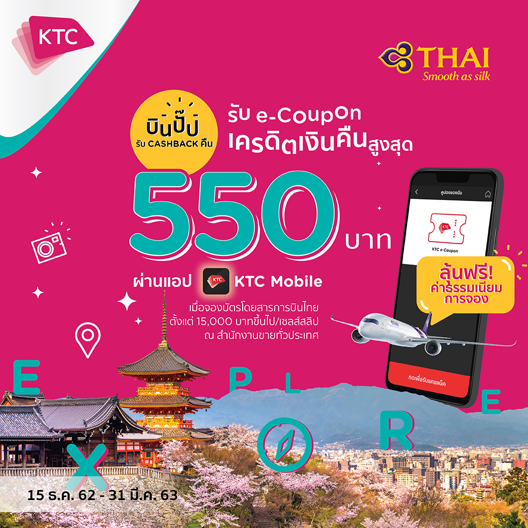 24 ธันวาคม 2562 : “เคทีซี” หรือ บริษัท บัตรกรุงไทย จำกัด (มหาชน) ร่วมกับการบินไทย จัดแคมเปญเด็ดส่งท้ายปี กับ “ลุ้นฟรีค่าธรรมเนียมการจอง รับ e-Coupon เครดิตเงินคืนสูงสุด 550 บาท” เอาใจสมาชิกบัตรเครดิตเคทีซีที่ ชื่นชอบการเดินทางกับการบินไทย เมื่อจองบัตรโดยสารการบินไทยตั้งแต่ 15,000 บาทขึ้นไป/เซลล์สลิป และชำระค่าบัตรโดยสารด้วยบัตรเครดิตเคทีซีที่สำนักงานการบินไทยทุกสาขาทั่วประเทศ รับสิทธิ์ลุ้น e-Coupon 1 รางวัล มูลค่าสูงสุด 550 บาท ผ่านทางแอป “KTC” Mobile” ระหว่างวันที่ 15 ธันวาคม 2562 – 31 มีนาคม 2563 ![]()