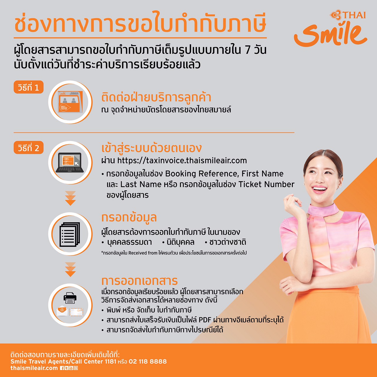 3 มกราคม 2563 : สายการบินไทยสมายล์ เปิดให้บริการขอออกใบกำกับภาษีอิเล็กทรอนิกส์ (e-Tax Invoice) ผ่านช่องทางออนไลน์ได้แล้ววันนี้ เพื่ออำนวยความสะดวกให้แก่ลูกค้าองค์กร ช่วยลดค่าใช้จ่ายเดินทาง ประหยัดเวลา สอดรับนโยบายสังคมไร้เงินสด ทั้งนี้ลูกค้าสามารถขอออกใบกำกับภาษีเต็มรูปแบบภายใน 7 วัน นับตั้งแต่วันที่ชำระค่าบริการเรียบร้อยแล้ว ได้ถึง 2 วิธี ได้แก่ วิธีที่ 1 ติดต่อฝ่ายบริการลูกค้า ณ จุดจำหน่ายบัตรโดยสารของไทยสมายล์ วิธีที่ 2 เข้าสู่ระบบด้วยตนเองผ่านทาง https://taxinvoice.thaismileair.com และเลือกกรอกข้อมูลตามประเภทของใบกำกับภาษีที่ต้องการ เมื่อกรอกข้อมูลเรียบร้อยแล้ว ผู้โดยสารสามารถเลือกวิธีการจัดส่งเอกสารได้หลายช่องทางทั้งจัดพิมพ์ด้วยตัวเอง หรือเลือกจัดเก็บใบกำกับภาษี สามารถส่งใบเสร็จรับเงินเป็นไฟล์ PDF ผ่านทางอีเมล์ตามที่ระบุ และสามารถเลือกจัดส่งใบกำกับภาษีทางไปรษณีย์ได้ สอบถามรายละเอียดเพิ่มเติมได้ที่Call Center 1181 หรือ 02-118-8888 ![]()