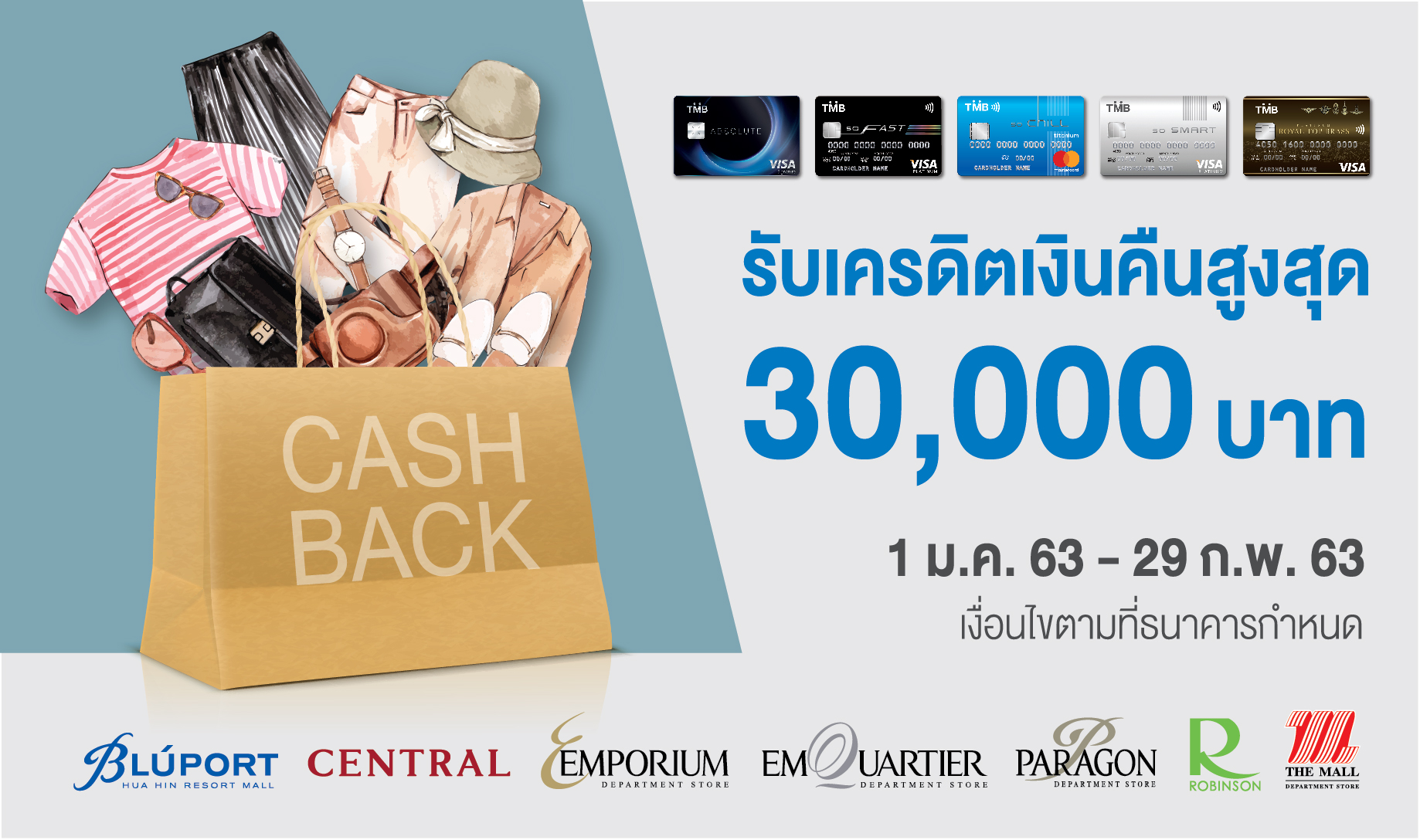 6 มกราคม 2563 : บัตรเครดิต TMB บัตรเดียวที่ให้ช้อปสนุก ยิ่งช้อป ยิ่งได้มากกว่า พร้อมรับเครดิตเงินคืนสูงสุด 30,000 บาท เมื่อช้อปตามเงื่อนไขที่กำหนดกับห้างสรรพสินค้าที่ร่วมรายการ ได้แก่ ห้างสรรพสินค้าเซ็นทรัลทุกสาขา เดอะมอลล์ทุกสาขา เอ็มโพเรียม เอ็มควอเทียร์ สยามพารากอน บลูพอร์ต และโรบินสันทุกสาขา