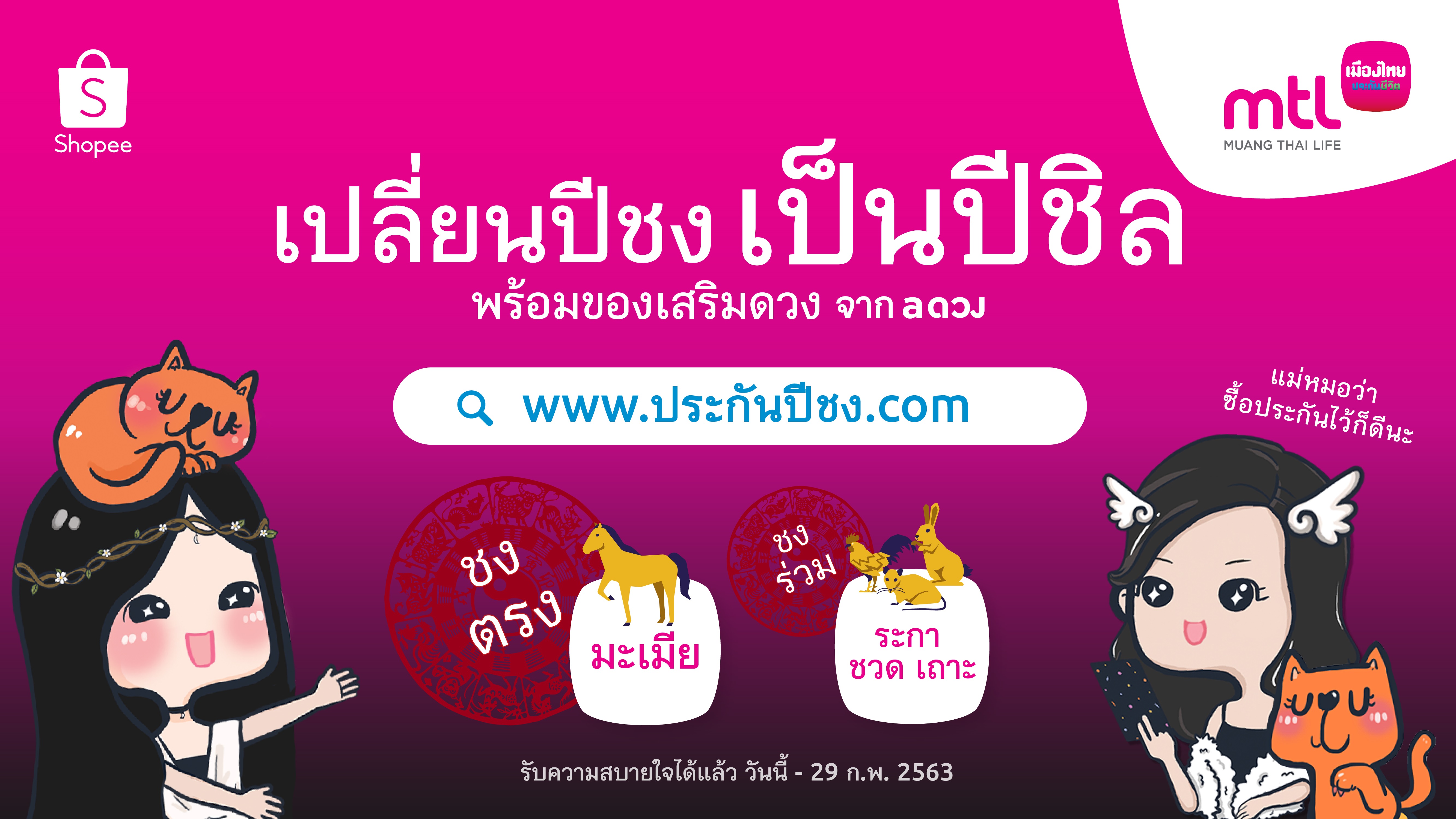 ทั้งนี้ผู้ที่เกิดในปีชงและอยาก #เปลี่ยนปีชงเป็นปีชิล สามารถเข้าไปเช็กดวงจาก a ดวง หรือ ดูรายละเอียดเพิ่มเติมได้ที่ www.ประกันปีชง.com หรือ Shopee ได้ตั้งแต่วันที่ 14 ม.ค. – 29 ก.พ. 2563 และสามารถเข้าถึงร้านค้าออฟฟิศเชียล “Muang Thai Life Official” ได้โดยสามารถดาวน์โหลดช้อปปี้แอปพลิเคชันได้ฟรีจาก App Store หรือ Google Play Store หรือเข้าไปที่เว็บไซต์ www.shopee.co.th/muangthailife ![]()