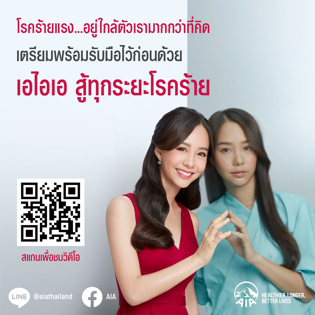 ติดตามภาพยนตร์โฆษณาชุด ‘เอไอเอ สู้ทุกระยะโรคร้าย’ ได้ทาง AIA Official Facebook Page และทาง AIA Thailand YouTube Channel รวมถึงสื่อออนไลน์อื่น ๆ ตั้งแต่วันนี้เป็นต้นไป หรือสแกน QR Code เพื่อรับชมภาพยนตร์โฆษณา ![]()