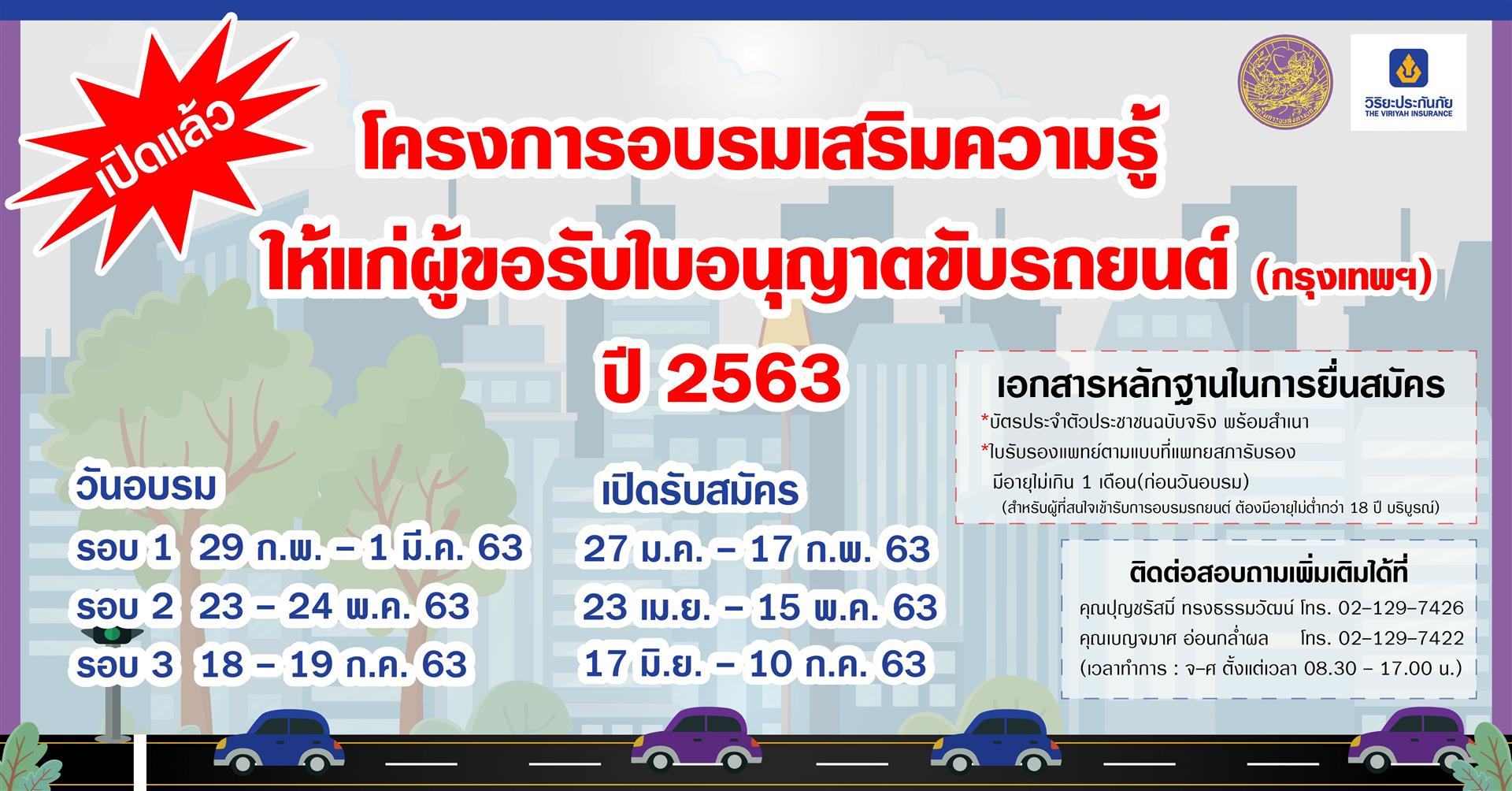 สำหรับในปี 2563 บริษัทฯ กำหนดจัดโครงการอบรมเสริมความรู้ให้แก่ผู้ขอรับใบอนุญาตขับรถยนต์ จำนวนทั้งหมด 3 รุ่นด้วยกัน โดยรุ่นแรกจะจัดขึ้นในวันที่ 29 กุมภาพันธ์ – 1 มีนาคม 2563 ส่วนอีกสองรุ่นจัดขึ้นในวันที่ 23 – 24 พฤษภาคม 2563 และ วันที่ 18 – 19 กรกฎาคม 2563 ณ อาคาร 4 ชั้น 3 กรมการขนส่งทางบก จตุจักร กรุงเทพฯ (เปิดรับสมัครรุ่นแรก ตั้งแต่วันที่ 27 มกราคม – 17 กุมภาพันธ์ 2562)