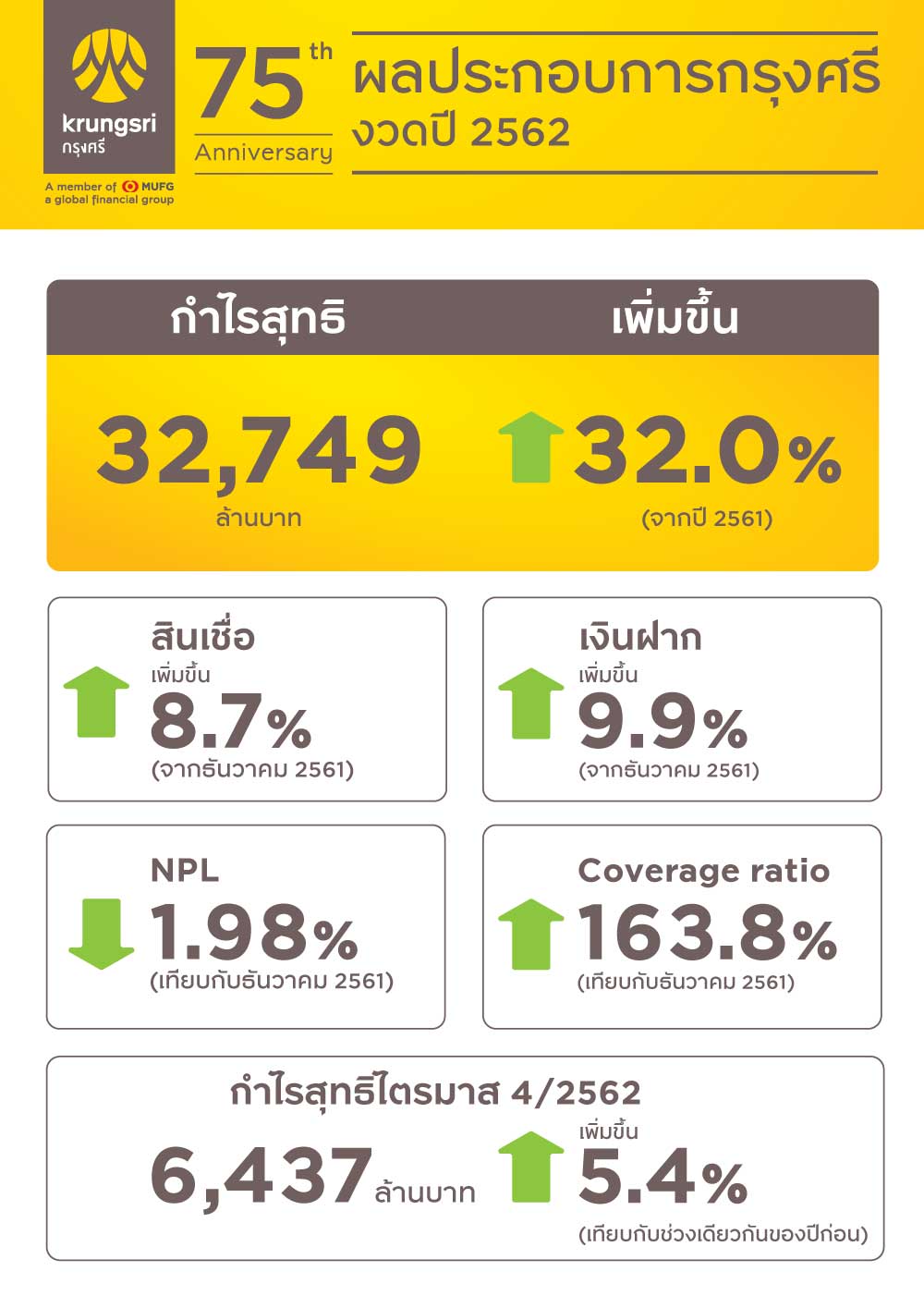 · การเติบโตของเงินให้สินเชื่อ: เพิ่มขึ้น 8.7% หรือจำนวน 146 พันล้านบาท จาก ณ สิ้นเดือนธันวาคม 2561 เงินให้สินเชื่อมีการเติบโตครอบคลุมทุกกลุ่มธุรกิจ โดยมีสินเชื่อเพื่อรายย่อยเป็นหนึ่งในแรงขับเคลื่อนหลัก ซึ่งเพิ่มขึ้นอย่างโดดเด่นที่ 11.1% สะท้อนตำแหน่งผู้นำทางการตลาดของกรุงศรีในธุรกิจสินเชื่อเพื่อรายย่อย ขณะที่สินเชื่อเพื่อธุรกิจเพิ่มขึ้น 6.6%