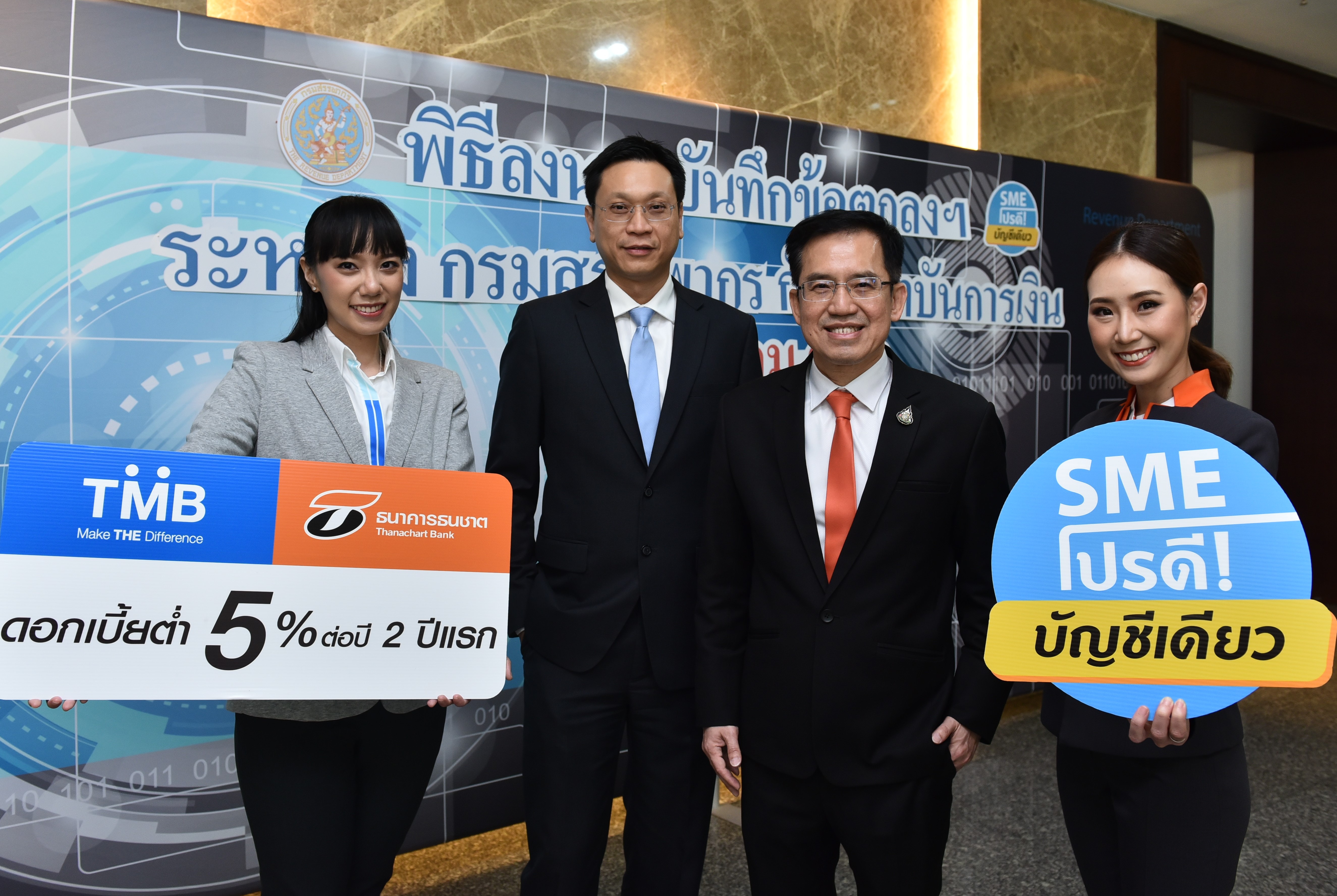 21 มกราคม 2563 : ธนาคารทีเอ็มบี และธนาคารธนชาต ประเดิมความร่วมมือแรกของปี 2563 ขานรับนโยบายภาครัฐ สนับสนุนให้เอสเอ็มอีใช้บัญชีเดียวในการแจ้งรายได้เพื่อยื่นขอสินเชื่อด้วยเอกสาร ภ.พ. 30 (แบบแสดงรายการสรุปภาษีซื้อ-ภาษีขาย) โดย เสนธิป ศรีไพพรรณ ประธานเจ้าหน้าที่บริหารลูกค้าธุรกิจ ทีเอ็มบี (ที่ 2 จากซ้าย) และ อนุวัติร์ เหลืองทวีกุล รองกรรมการผู้จัดการ ธุรกิจลูกค้ารายย่อยและลูกค้าธุรกิจขนาดเล็ก ธนชาต (ที่ 3 จากซ้าย) ร่วมพิธีลงนามบันทึกข้อตกลงว่าด้วย การสนับสนุนผู้ประกอบการให้จัดทำบัญชี และงบการเงินให้ถูกต้องและสอดคล้องกับสภาพที่แท้จริงของกิจการ จัดโดยกรมสรรพากร