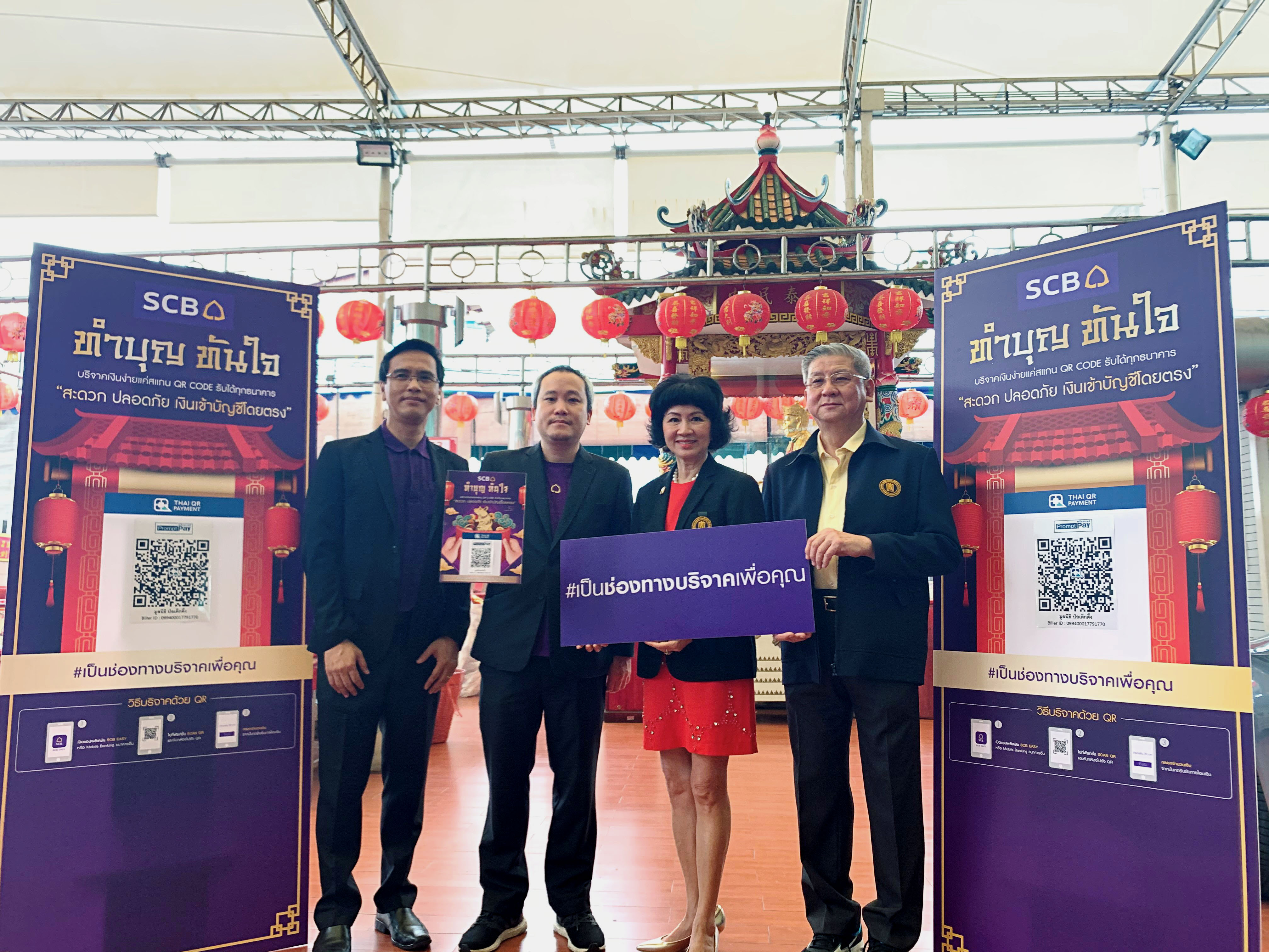โดยไม่ต้องเก็บหลักฐานใบเสร็จรับเงินหรือใบอนุโมทนาบัตร และยังได้รับการพิจารณาคืนเงินภาษีที่รวดเร็วอีกด้วย เพียงเท่านี้ก็สามารถร่วมทำบุญกับทางมูลนิธิป่อเต็กตึ๊ง เพิ่มความสะดวก สบาย ปลอดภัย ตอบโจทย์ไลฟ์สไตล์ผู้บริโภคสายบุญยุคดิจิทัล และตอกย้ำความมุ่งมั่นในการนำเสนอนวัตกรรมด้านการเงินใหม่ๆ อย่างไม่หยุดยั้งของธนาคาร โดยมี นายก่อ กิตติกรณ์ (ที่ 2 จากซ้าย) ผู้อำนวยการ ผู้บริหารส่วน Digital Payment Disruptive Innovation ธนาคารไทยพาณิชย์ และนางสิริกุล โอภาสวงศ์ (ที่ 2 จากขวา) กรรมการและเหรัญญิก มูลนิธิป่อเต็กตึ๊ง ร่วมเปิดตัว เมื่อเร็วๆ นี้ ![]()