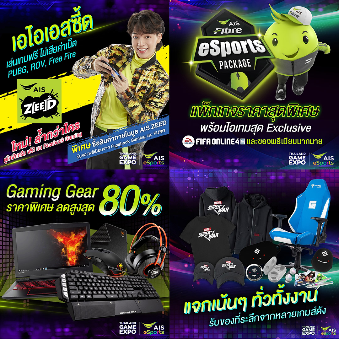 · พบกับโปรโมชั่นแพ็กเกจมือถือและเน็ตบ้านจาก AIS พร้อมทัพสมาร์ทโฟนเกมมิ่ง, โน้ตบุ๊ก, คอมพิวเตอร์, และเกมมิ่งเกียร์รุ่นใหม่ล่าสุด จากพันธมิตรด้านเกมมิ่งชั้นนำ อาทิ Banana IT, J.I.B., Acer Predator, AMD Steelseries, Asus ROG, HP Omen, Lenovo Legion, MSI และ Razer นำมาจำหน่ายในราคาพิเศษ ลดสูงสุดถึง 80% และยังได้ลุ้นรับฟรี! แรร์ไอเทมจากเกมยอดฮิต PUBG Mobile , MARVEL Super War, Call Of Duty Mobile, FIFA ONLINE4 , Blade & Soul และ Black Desert พร้อมร่วมกิจกรรมกับค่ายเกมชั้นนำทุกแพลตฟอร์มมากมาย