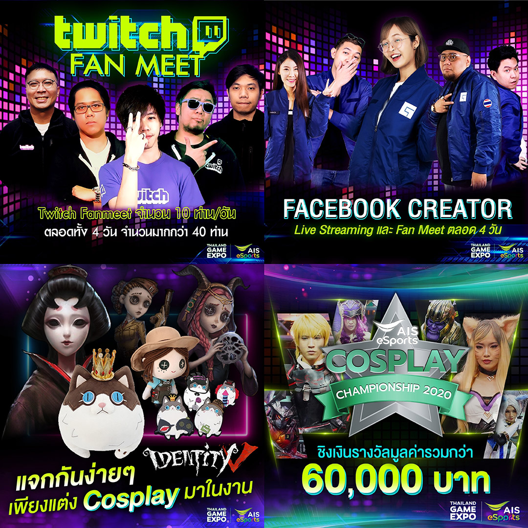 · ใกล้ชิดกว่าใคร! กระทบไหล่เกมเมอร์, เหล่าแคสเตอร์ และอินฟลูเอนเซอร์คนดัง จาก Twitch และ Facebook Gaming มากกว่า 70 ชีวิต อาทิ ทีม Rubsarb, FPSThailand, Boyminoru, Fifatargrean, Gssspotted, CigaretteS และ เดียร์ลอง พร้อมเอาใจเกมเมอร์สายคอสเพลย์กับการแข่งขัน AIS eSports Cosplay Championship 2020 การแข่งขันคอสเพลย์ครั้งใหญ่ในประเทศไทย ชิงรางวัลมูลค่ารวม 60,000 บาท และชิงของรางวัลสุดพรีเมียมกับคอสเพลย์เกม Identity V