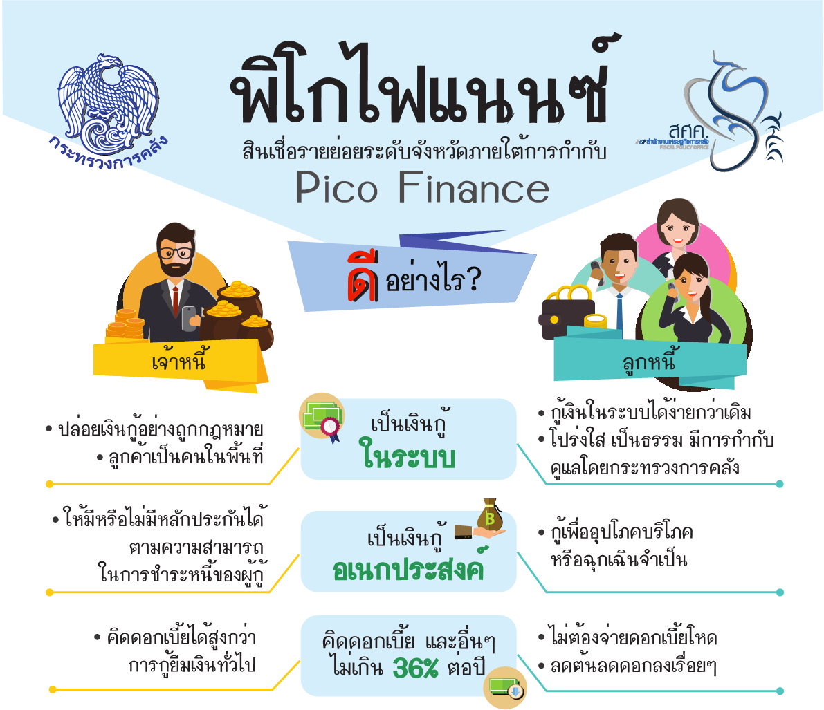 30 มกราคม 2563 : นายพรชัย ฐีระเวช ที่ปรึกษาด้านเศรษฐกิจการเงิน ในฐานะโฆษกสำนักงานเศรษฐกิจการคลัง เปิดเผยว่า ตั้งแต่เดือนตุลาคม 2562 ที่สำนักงานเศรษฐกิจการคลังได้มีการออกประกาศสำนักงานเศรษฐกิจการคลัง เรื่อง การกำหนดหลักเกณฑ์ วิธีการ และเงื่อนไขในการประกอบธุรกิจสินเชื่อรายย่อยระดับจังหวัดภายใต้การกำกับ (ฉบับที่ 2) ลงวันที่ 1 ตุลาคม พ.ศ. 2562 เพื่อปรับปรุงรูปแบบการจัดทำเอกสารแผนการดำเนินธุรกิจการให้สินเชื่อรายย่อยระดับจังหวัดภายใต้การกำกับ (สินเชื่อพิโกไฟแนนซ์)