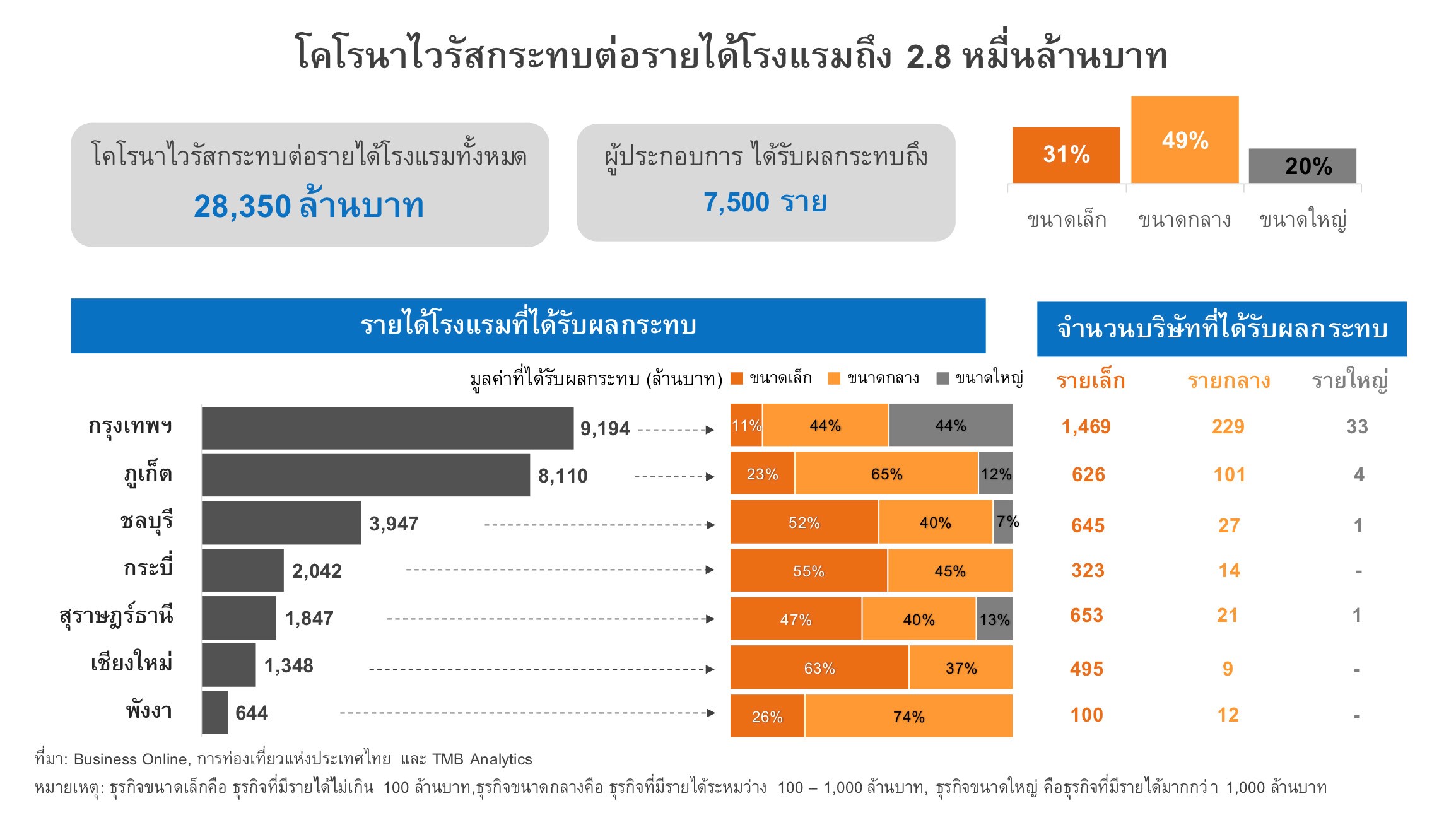 “รายได้ภาคการท่องเที่ยวที่ลดลงมาจากธุรกิจโรงแรม ร้านอาหารและค้าปลีก จะสูญเสียรายได้กว่า 7 หมื่นล้านบาท” เมื่อวิเคราะห์ผลกระทบต่อรายได้ภาคการท่องเที่ยว โดยแบ่งเป็นรายภาคธุรกิจพบว่ารายได้ธุรกิจโรงแรมหายไป 2.84 หมื่นล้านบาท