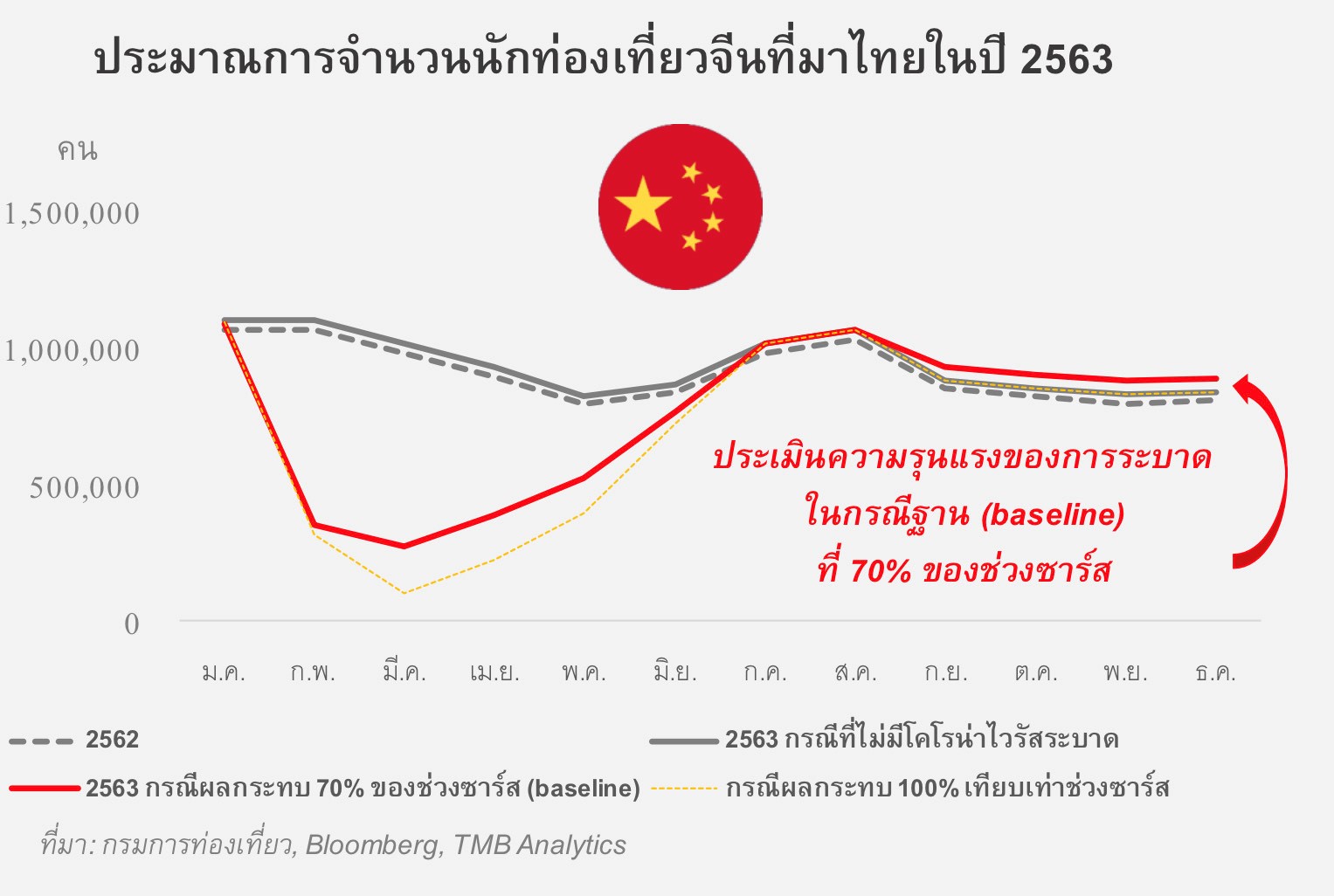 ดังนั้น ภาพรวมดีกรีผลกระทบจากไวรัสโคโรนาต่อภาคการท่องเที่ยวจะอยู่ที่ 70% โดยคาดการณ์นักท่องเที่ยวจีนลดลง 2.4 ล้านคนในช่วงครึ่งปีแรก ก่อนที่จะเริ่มกลับมาขยายตัวได้ในช่วงครึ่งปีหลัง ส่งผลให้จำนวนนักท่องเที่ยวต่างชาติโดยรวมทั้งปี 2563 จะอยู่ที่ 38.7 ล้านคน ลดลงจากระดับ 40.8 ล้านคนตามคาดการณ์เดิม และรายได้ภาคการท่องเที่ยวและธุรกิจเกี่ยวข้องลดลงกว่า 1 แสนล้านบาทหรือคิดเป็น 0.7% ของจีดีพี